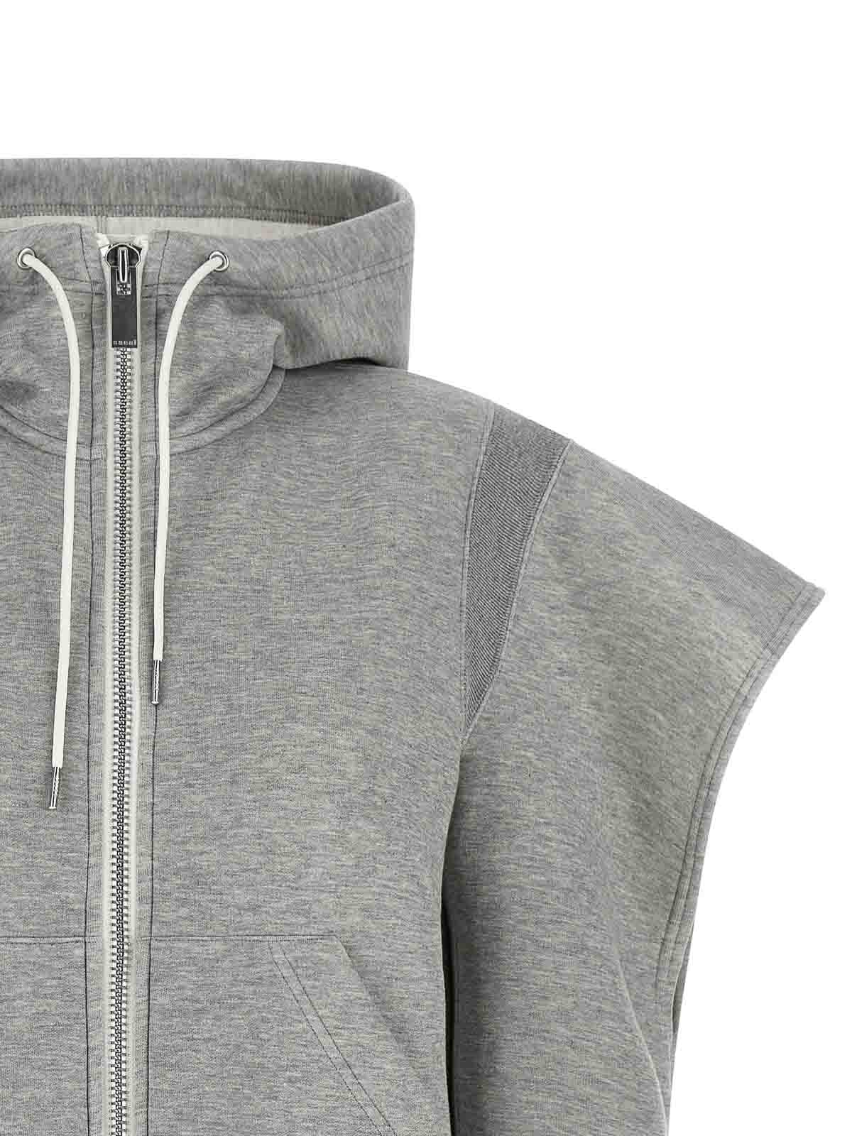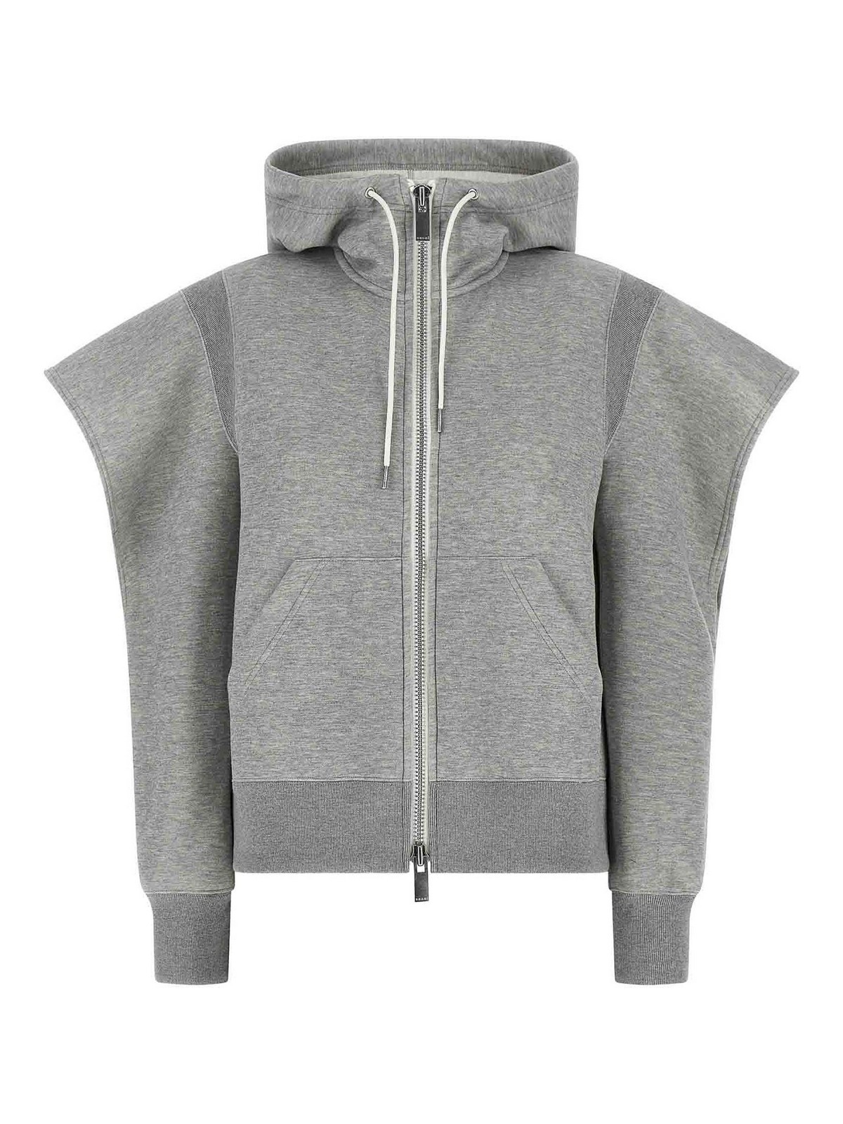 メランジコットン混紡のスポンジパーカー、ハイネック、フロントジッパー、ポケット、袖口付き長袖、肩にオープンポインテッドディテール、裾にバンド。