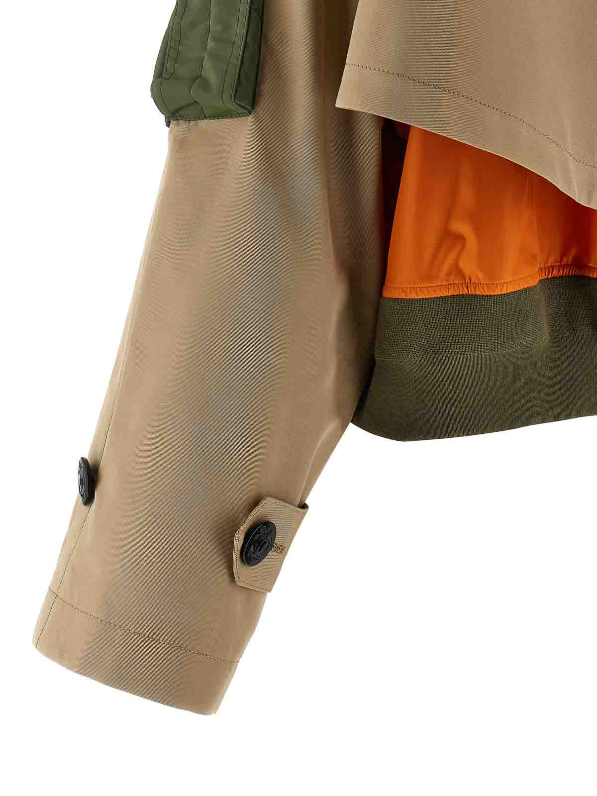 コットンギャバジントップ、ダブルブレストクロップスタイル、フロントボタン留めのダブルブレストクロップスタイル、取り外し可能なあごストラップ付きのシャツカラー、ショルダーパッド、ロングスリーブ、下にリブ編みのストレッチニットのディテールが施されたナイロンベスト、ハイネック、フロントジッパー、ポケット、裾にバンドが付いたダブルレイヤートレンチコート。