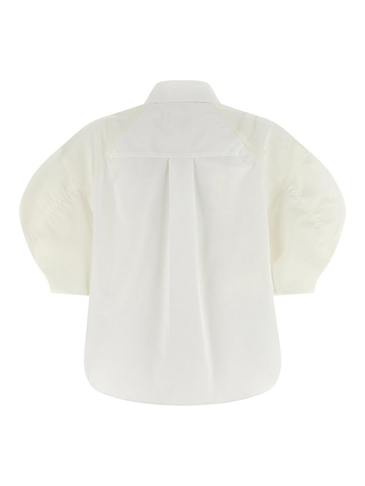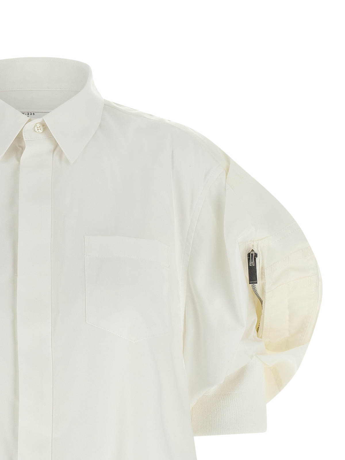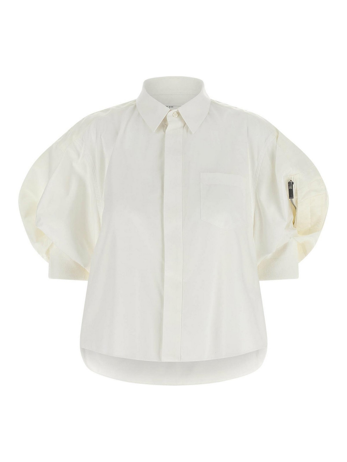 コットンポプリンシャツ、クロップモデル、ポケット、隠しフロントボタン留め、同系色のナイロンツイルインサートがストレッチニットの袖口、丸みを帯びたアシンメトリーな裾がパフボンバースリーブスタイルを演出します。
