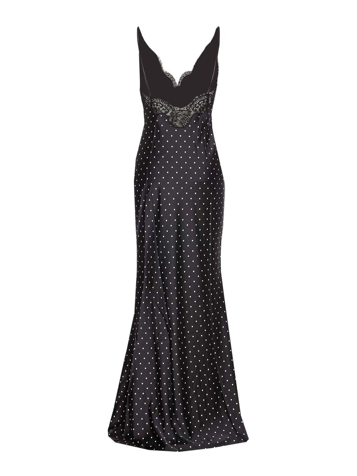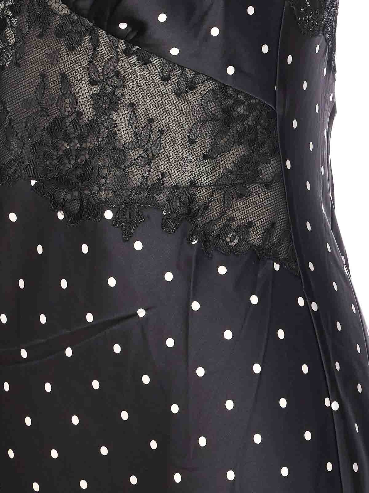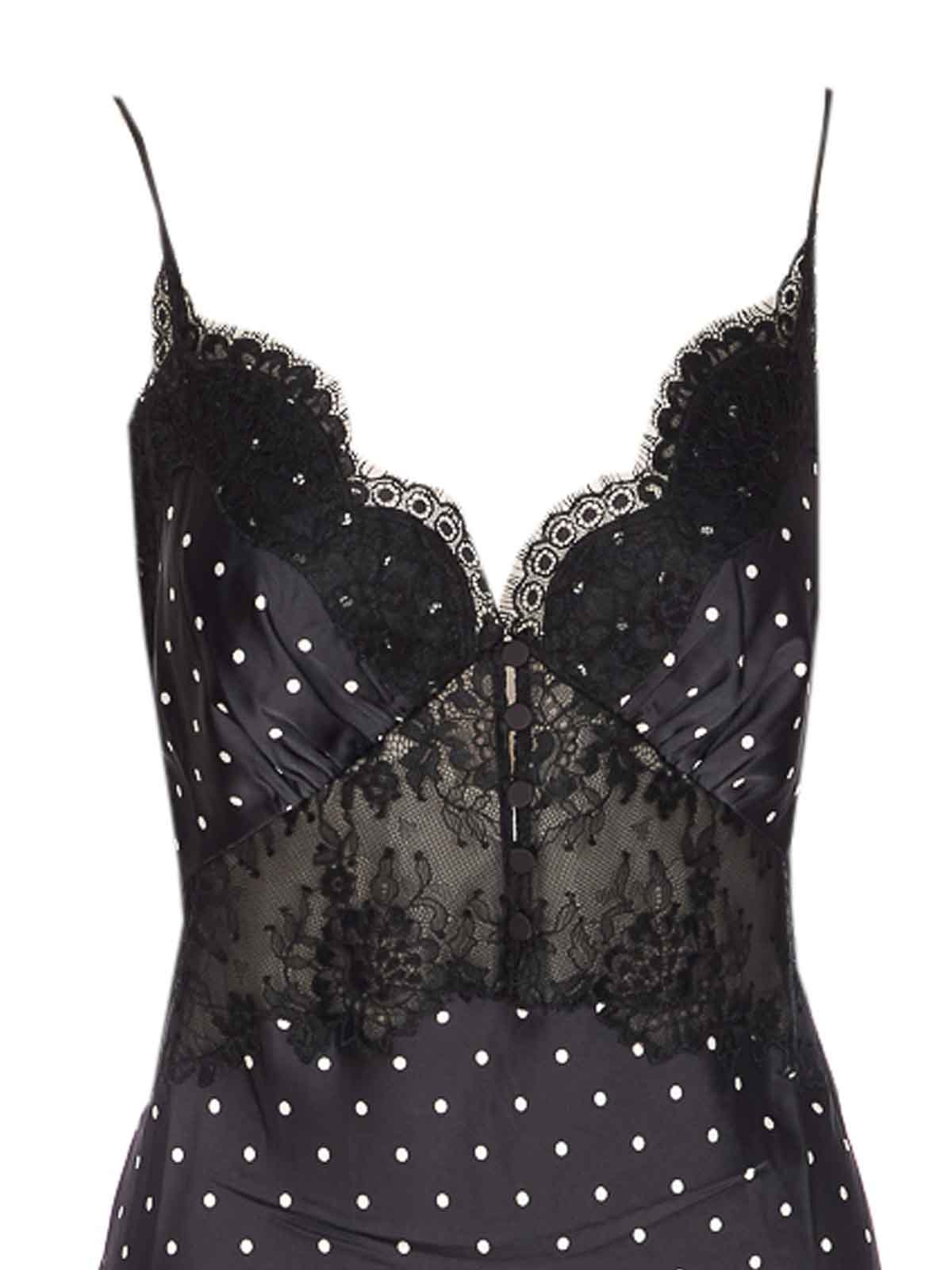 セルフポートレートブラック水玉サテンドレス、ボタン留め、レースディテール、全面ドットプリント、ロングスリーブ