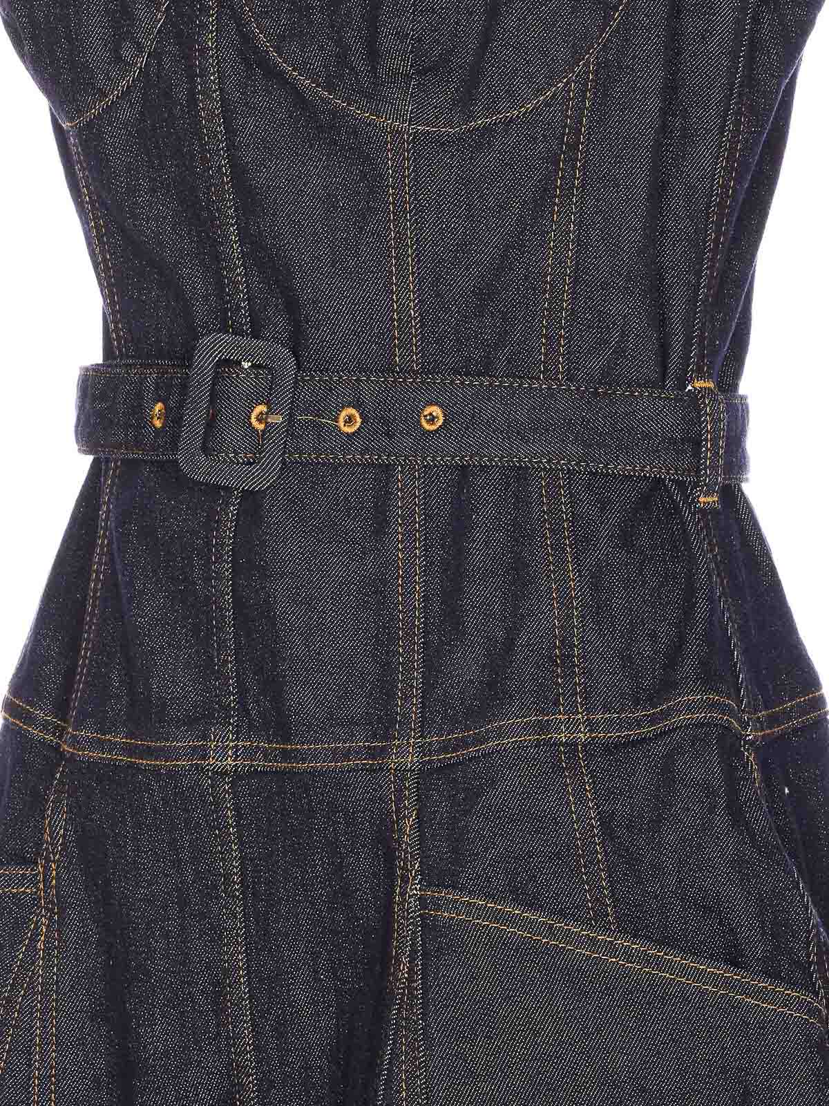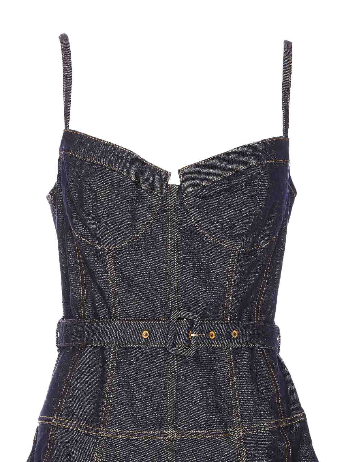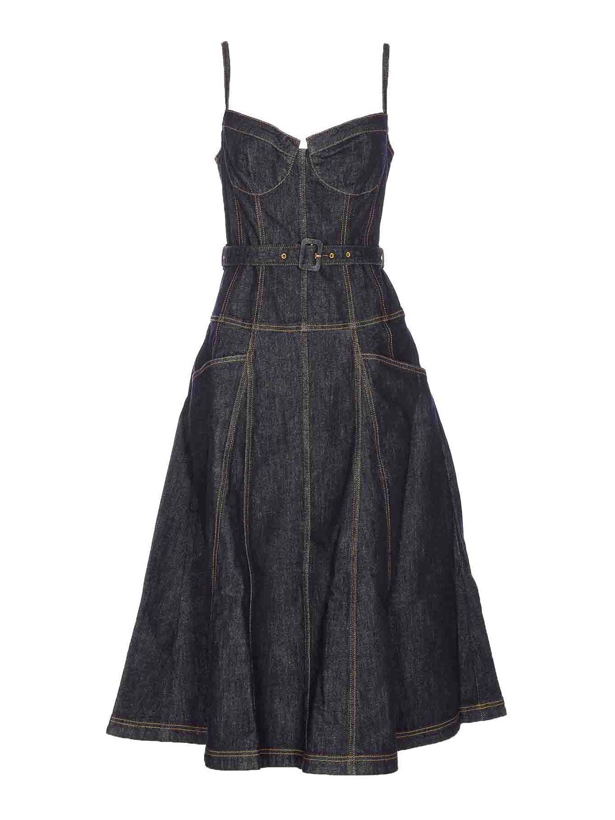 セルフポートレートデニムドレス、ジップクロージャー、細いショルダーストラップ、ウエストベルト、ミディモデル