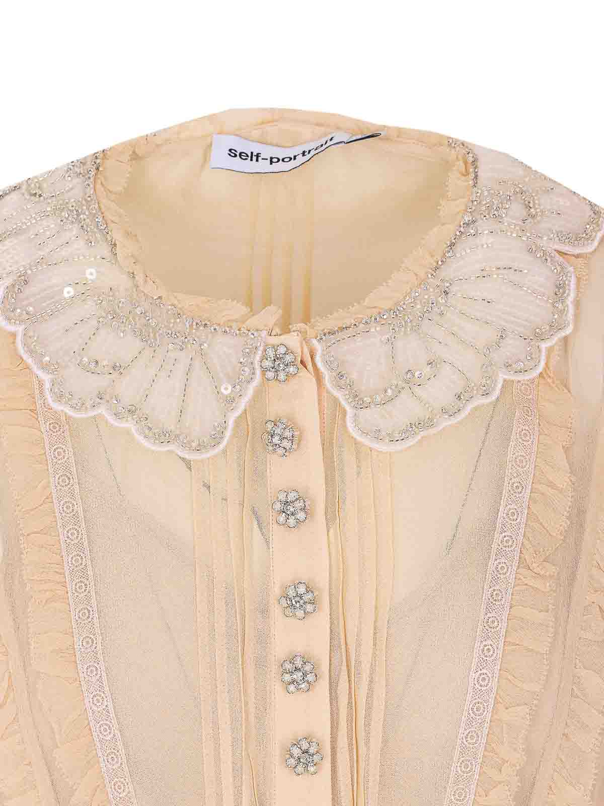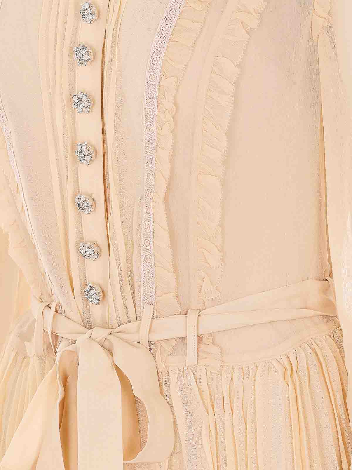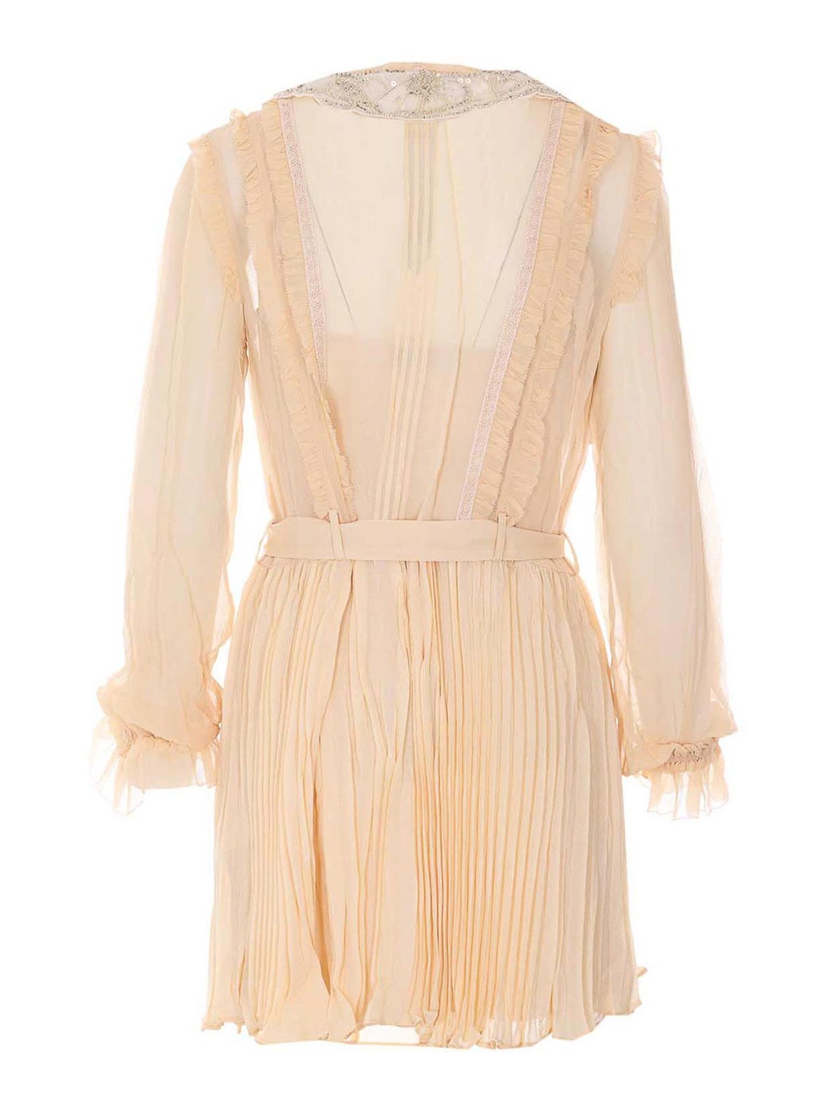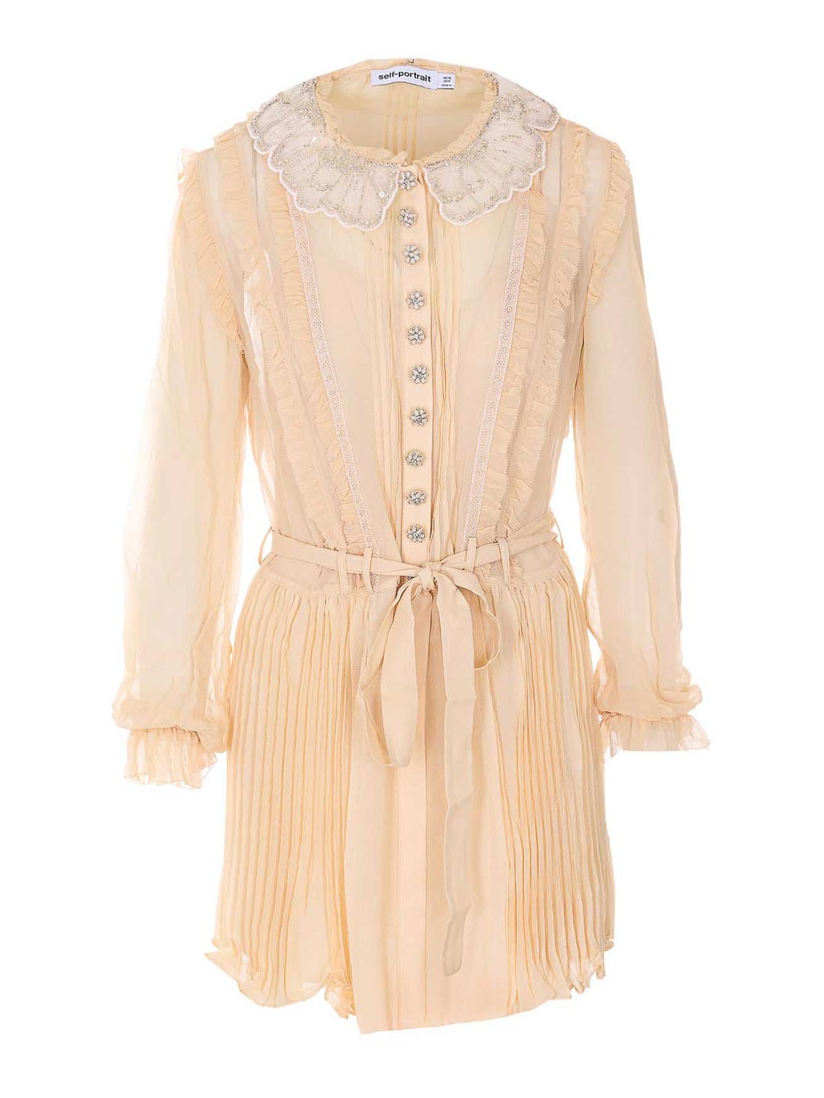 セルフポートレートタンプリーツジョーゼットドレス、ミニドレス、ボタン留め、長袖、ウエストにベルト