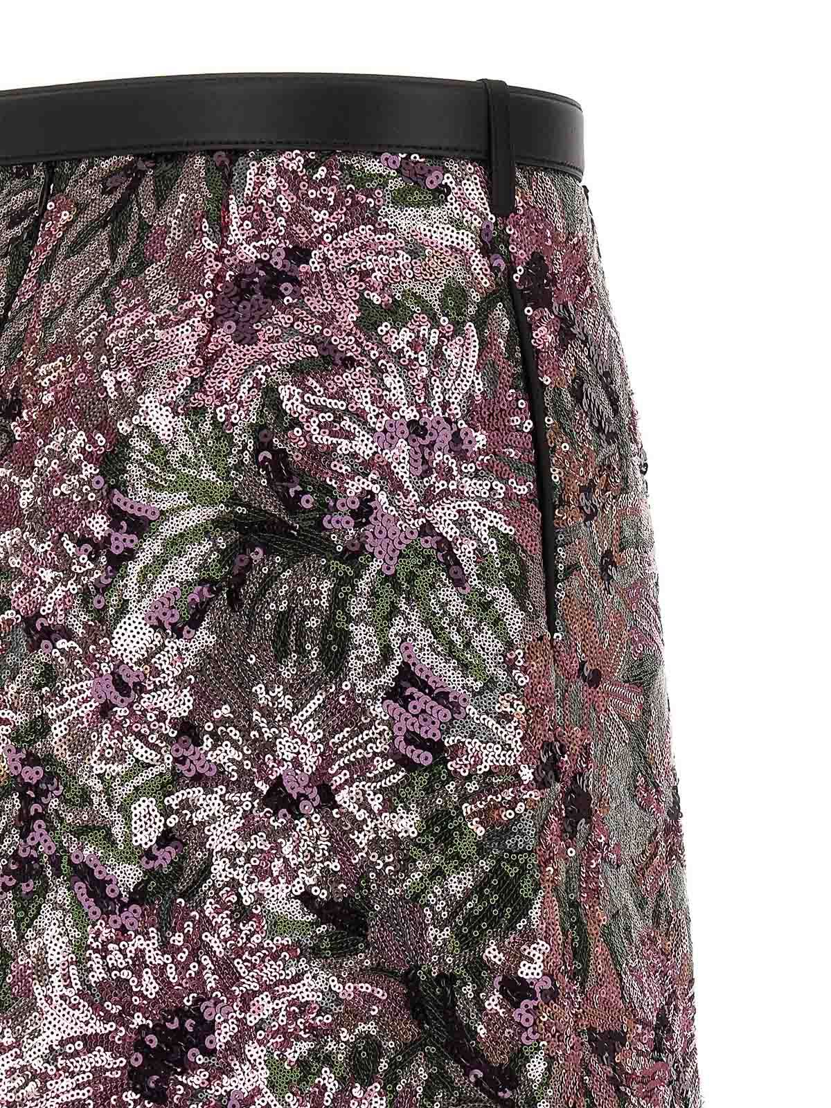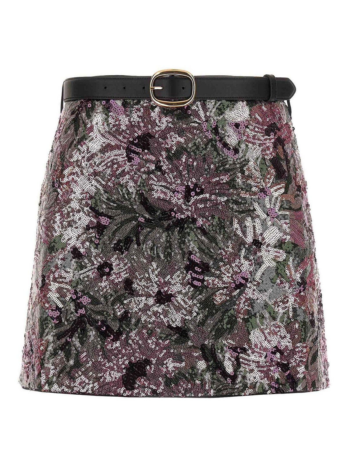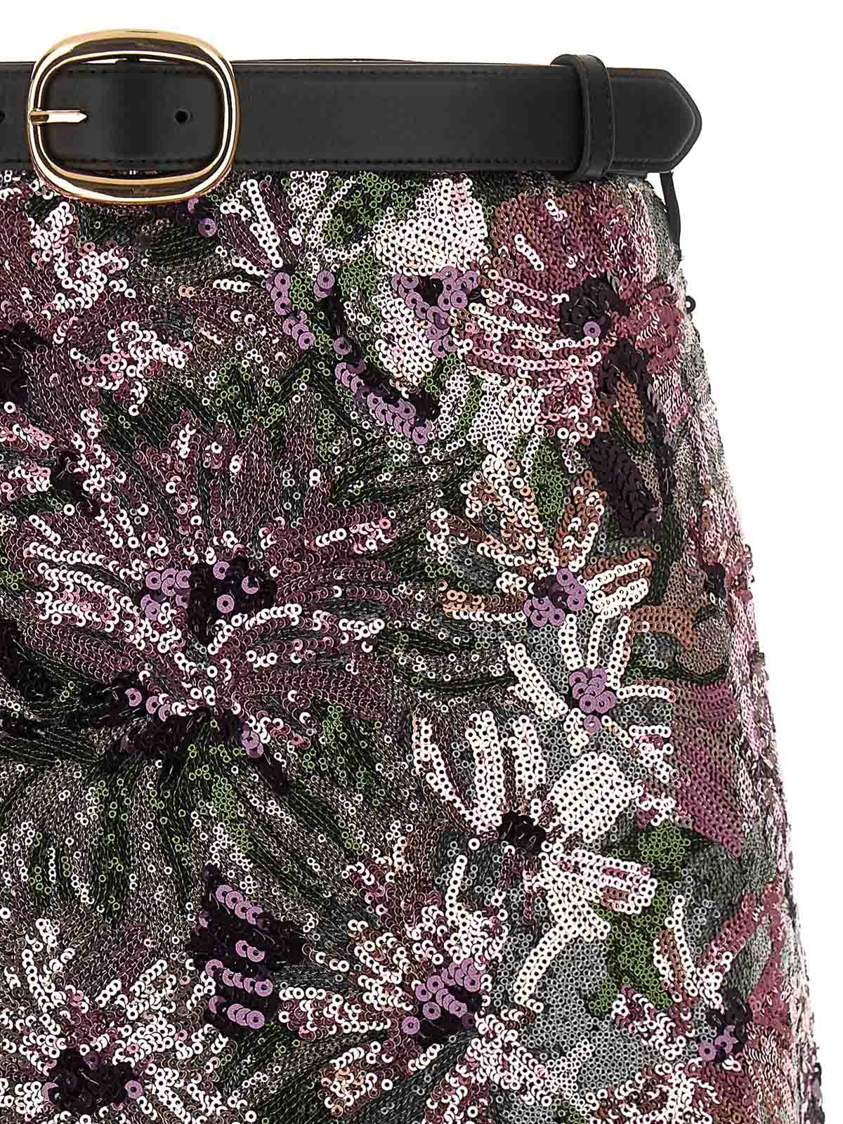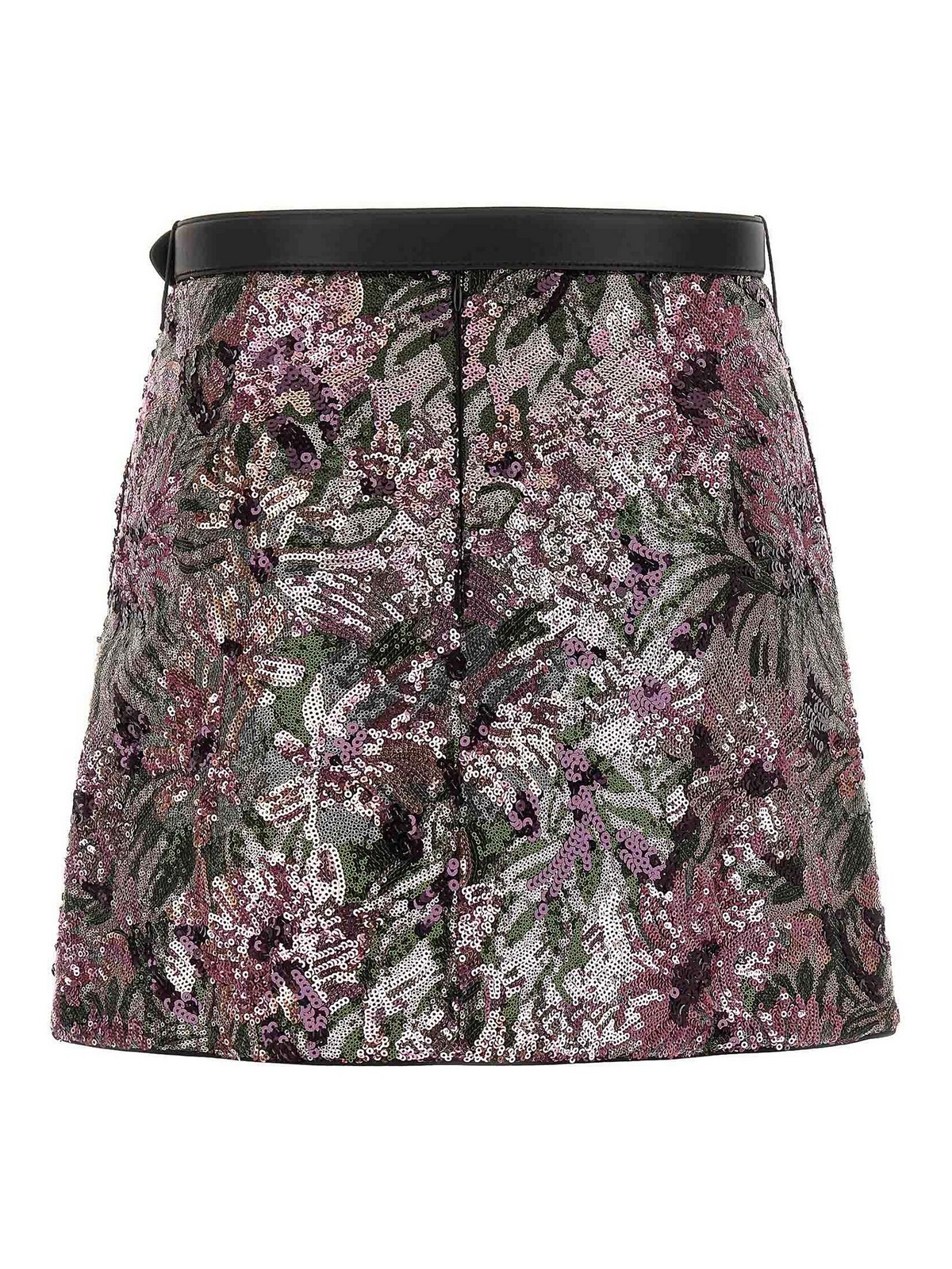 花柄スパンコールミニファブリックスカート。マルチカラーの花柄スパンコール刺繍、ポケット、バックファスナー、裏地、取り外し可能なレザーベルト。