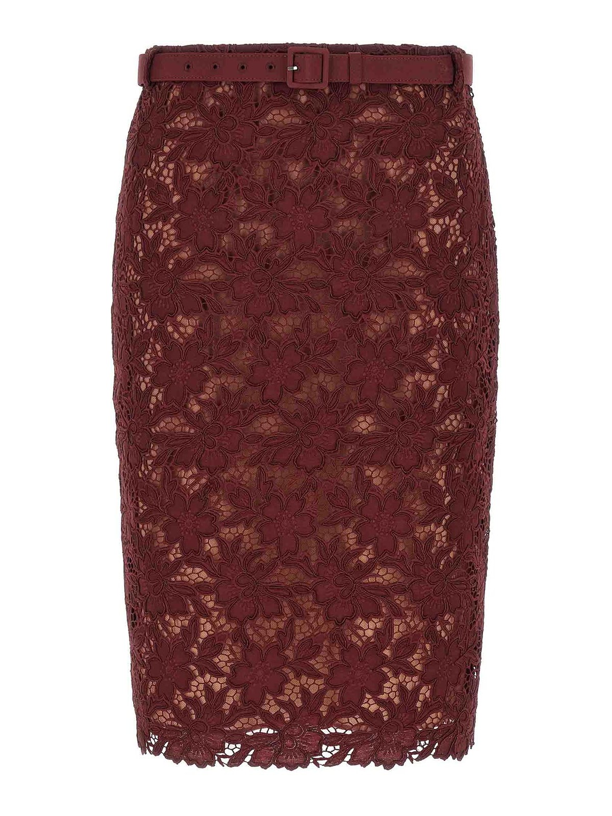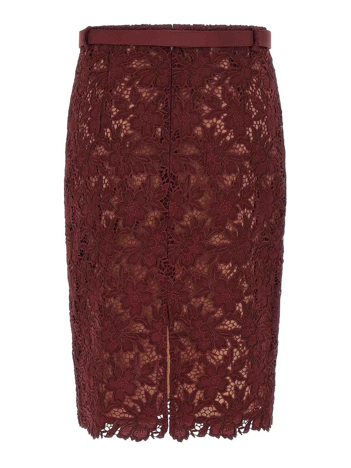 バーガンディギピュールレースミディフローラルギピュールレーススカート、裏地、シースドレス、ジッパー、バックスプリット、取り外し可能なマッチングベルト。