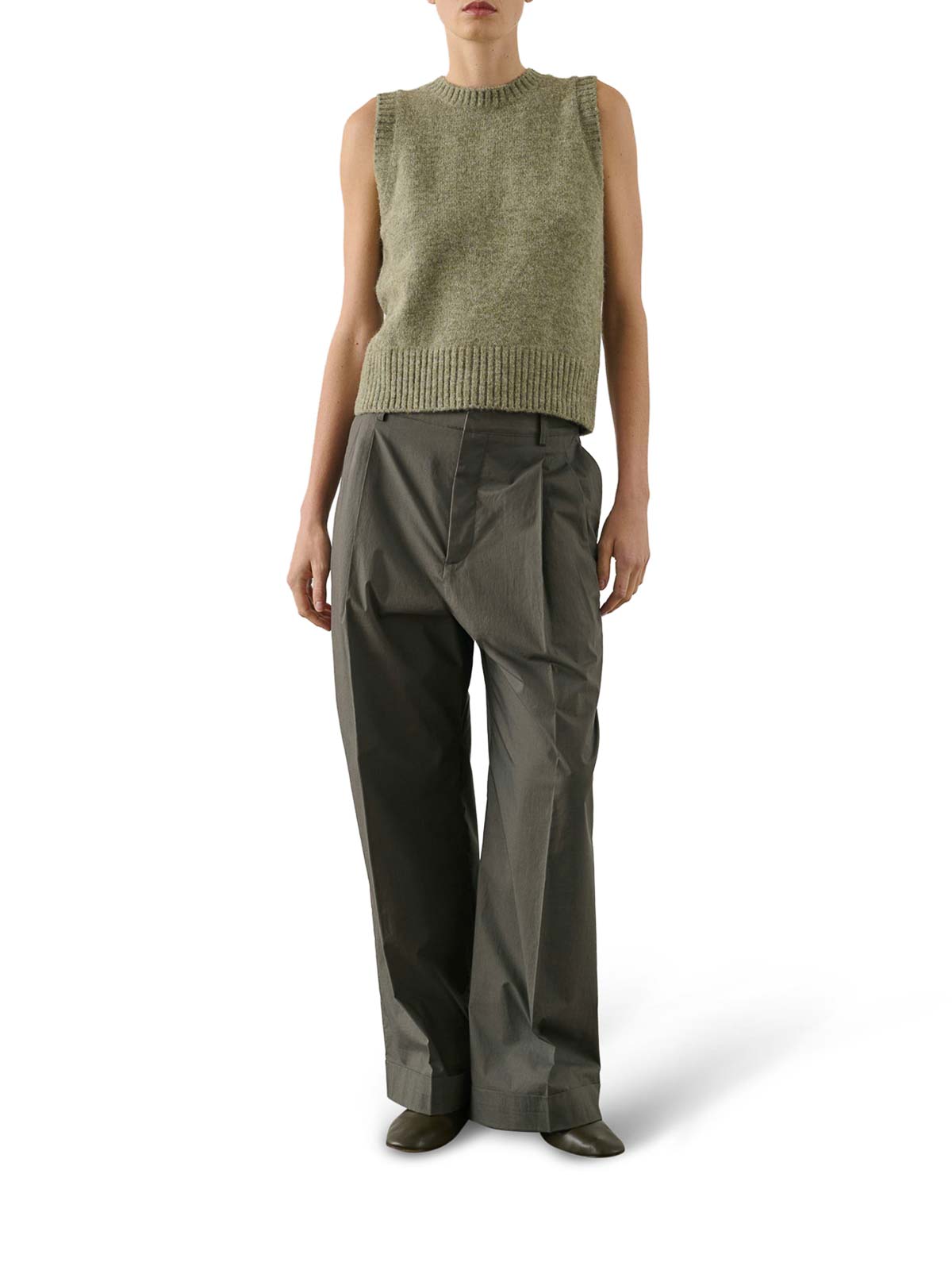 ハイウエスト、ワイドレッグ、隠しファスナー、フックアンドアイ、内側ボタン補強、フロントスラントポケット2つ、バックウェルトポケット2つ、脚に沿ってアイロンプリーツ、100% コットン、色:グレー/アンスラサイト