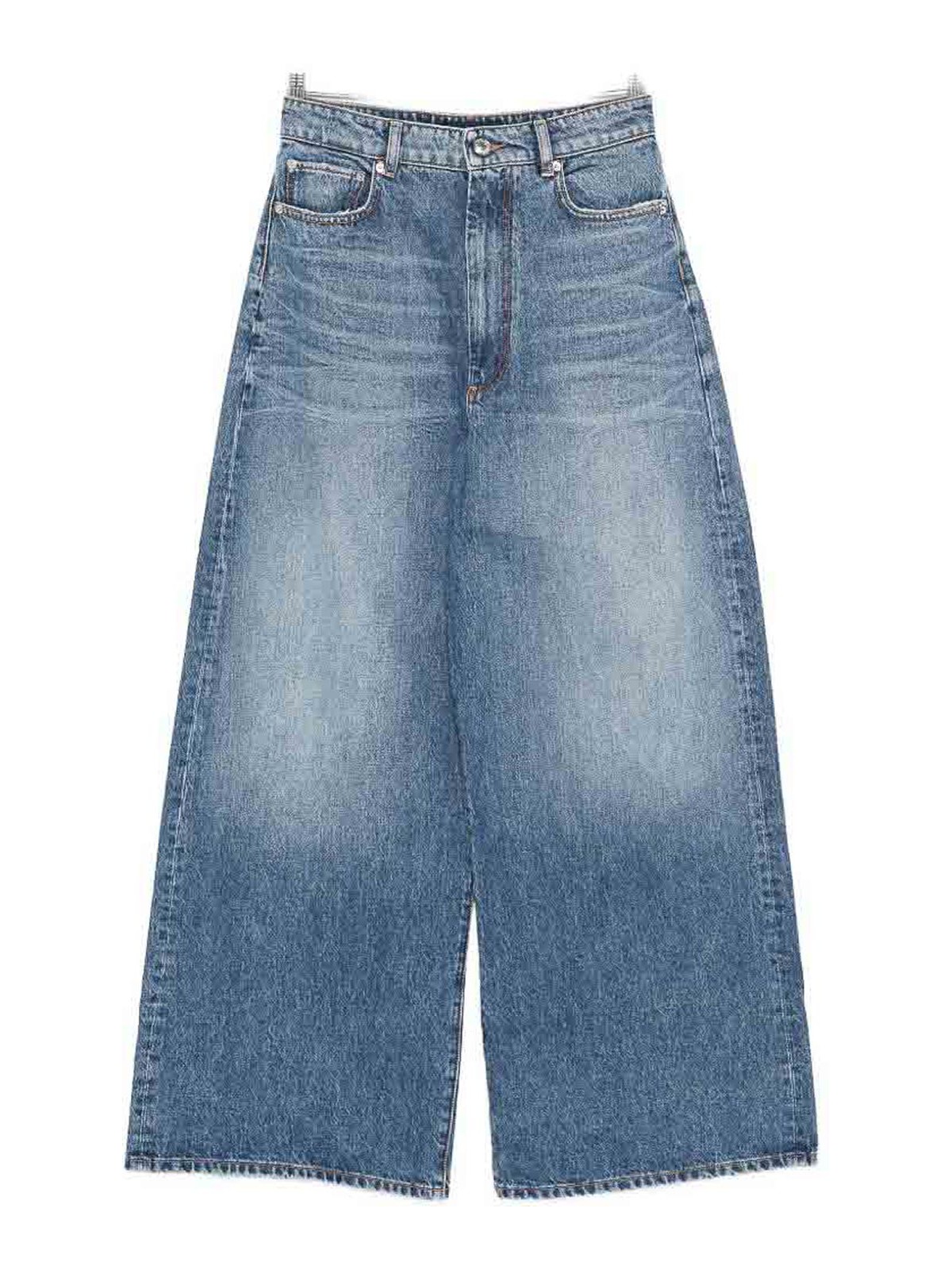 ブルー、ワイドレッグ、ポケット5つ、コンシールフライ、ボタン留め。