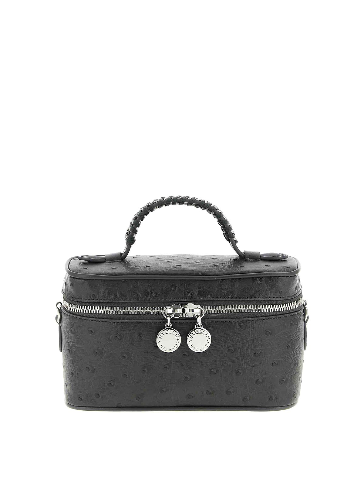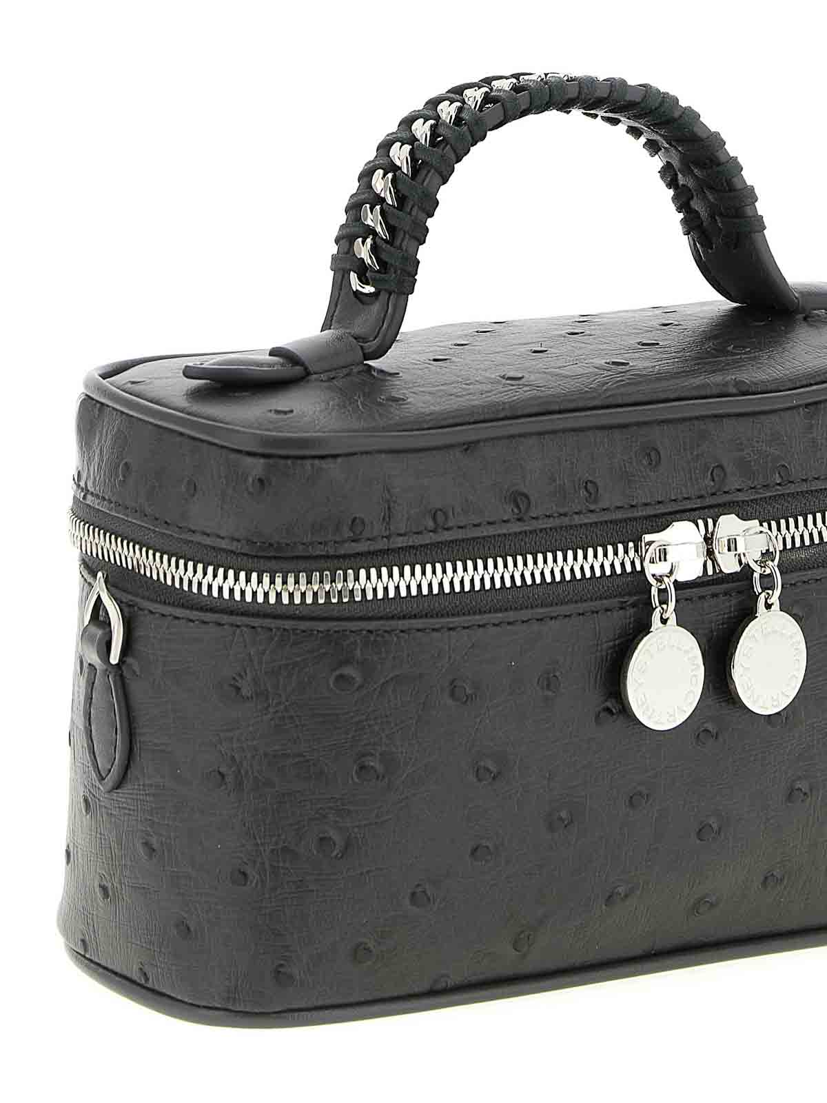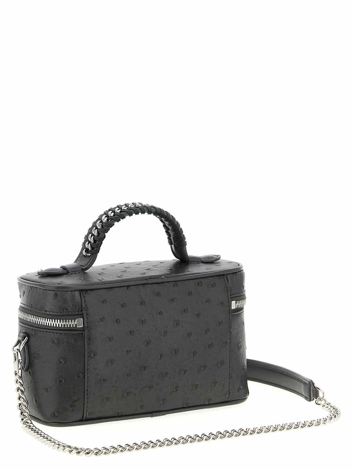 環境にやさしいオーストリッチのオルターマット生地を使用したバニティファラベラクロスボディバッグ、固定ハンドル、ジッパー開閉、取り外し可能なチェーンショルダーストラップ。