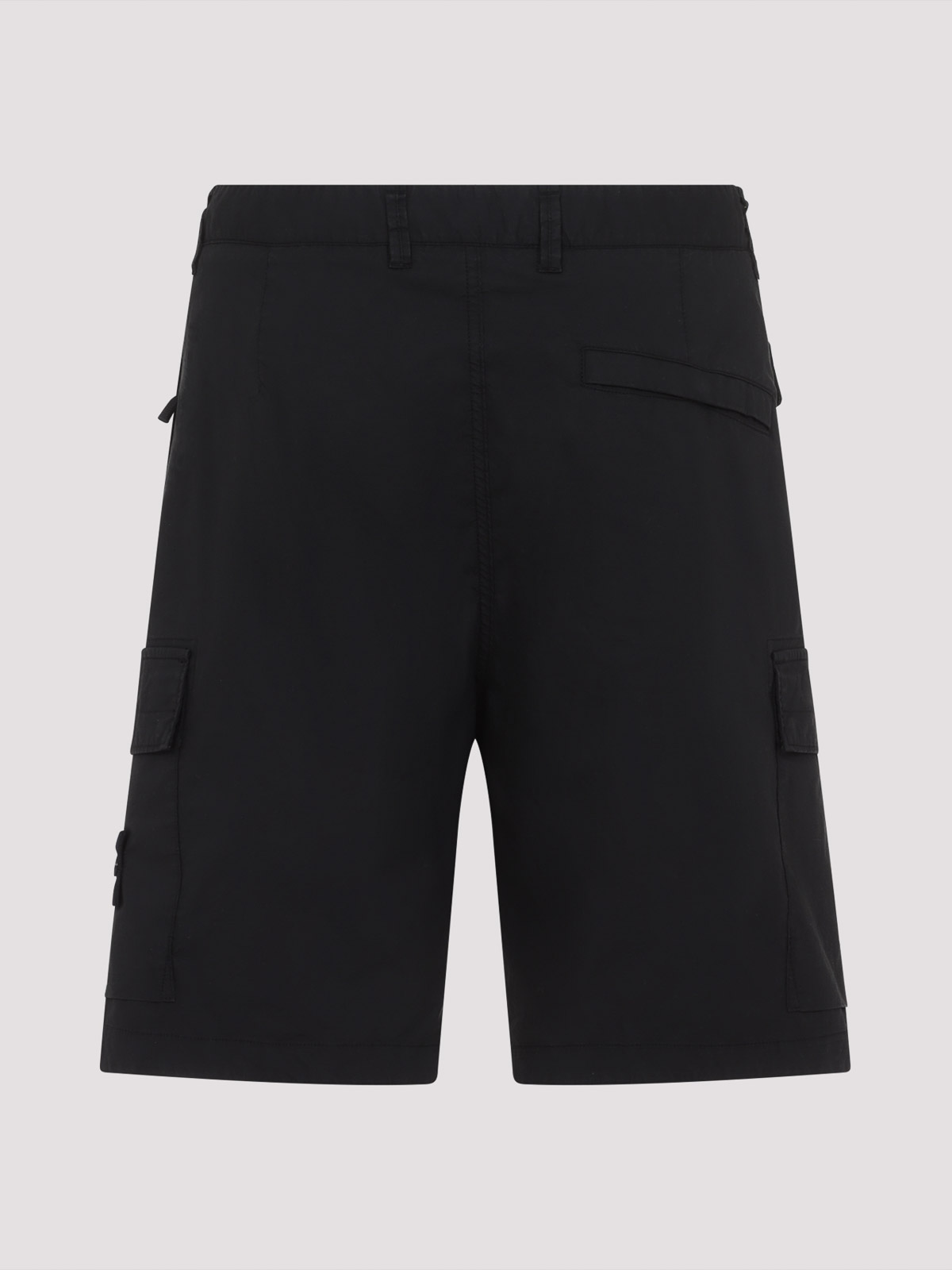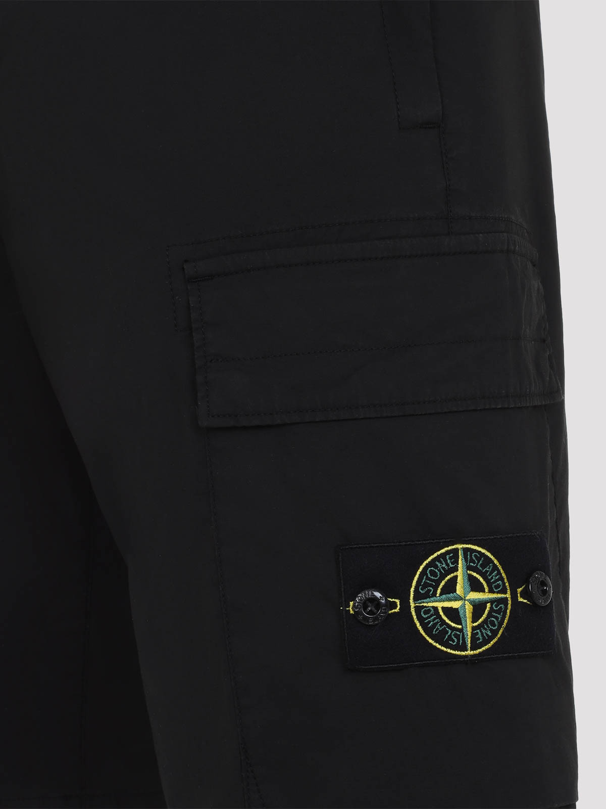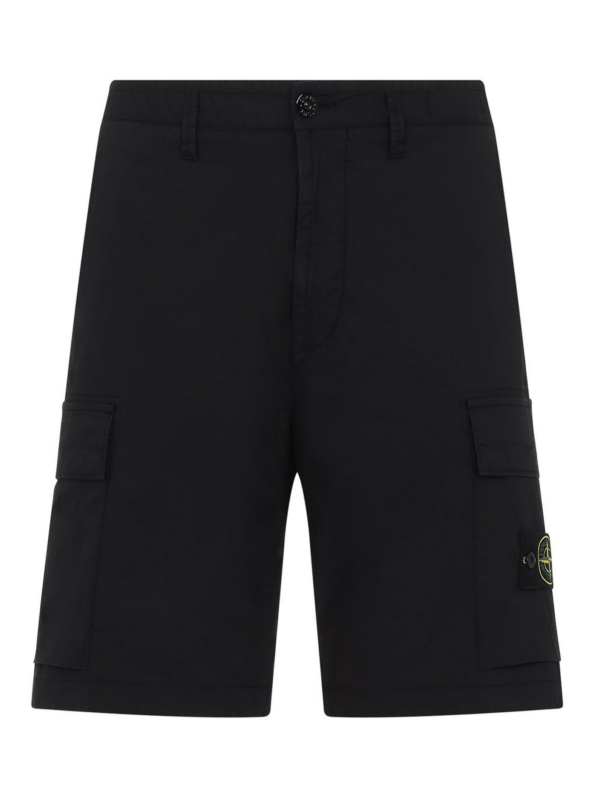 ストーンアイランドブラックコットンショーツ。ブラックコットン製、レギュラーウエスト、ベルトループ、フロントボタンとフライジッパー、サイドジッパーポケット、2つのサイドジップポケット、アイコニックなロゴパッチ付きのカーゴポケット、バックウェルトポケット、ストレートヘム。