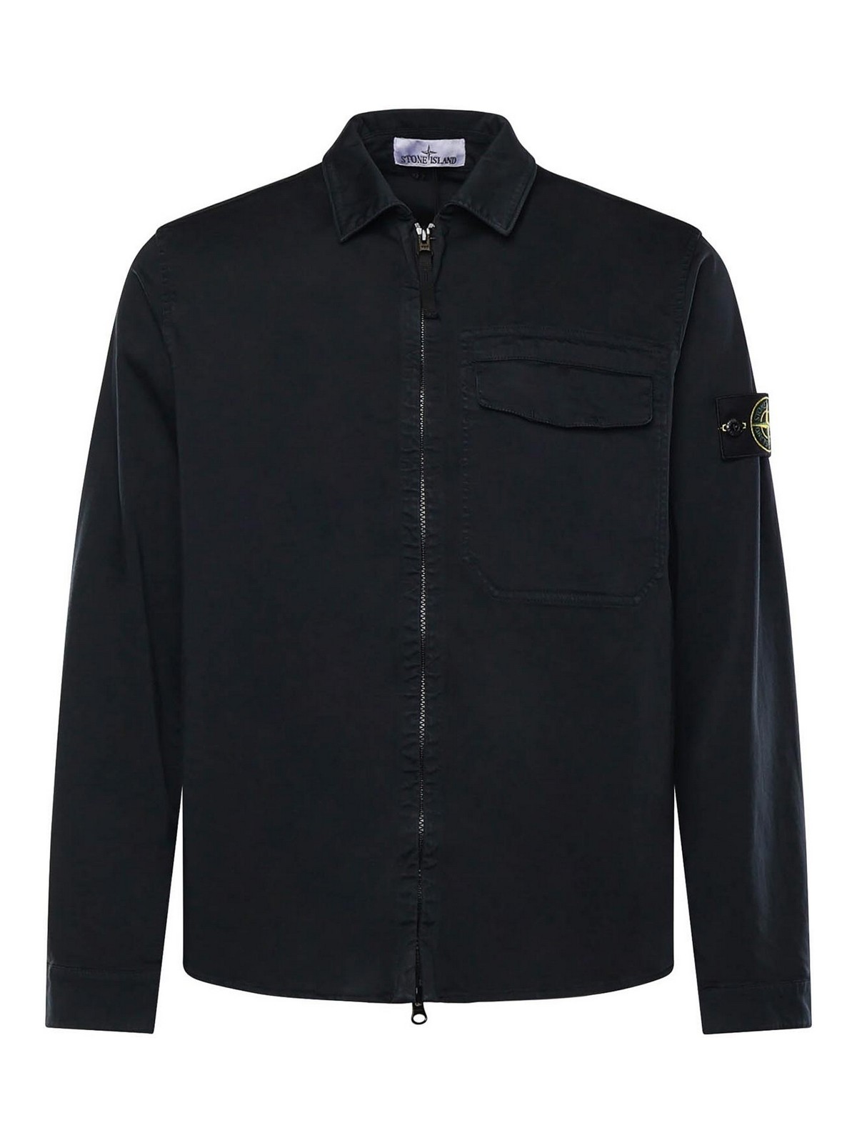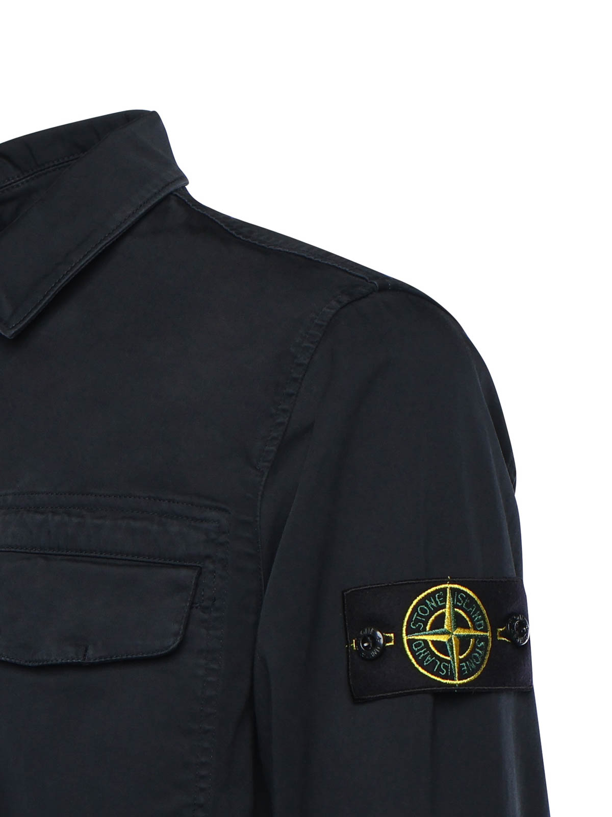 ストレッチオーガニックコットンサテン製、フロントファスナー開閉、ボタン付きパッチ胸ポケット、左袖にロゴバッジ、クラシックカラー