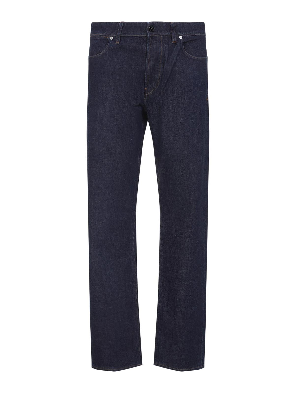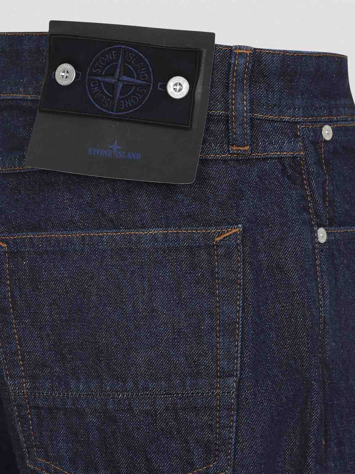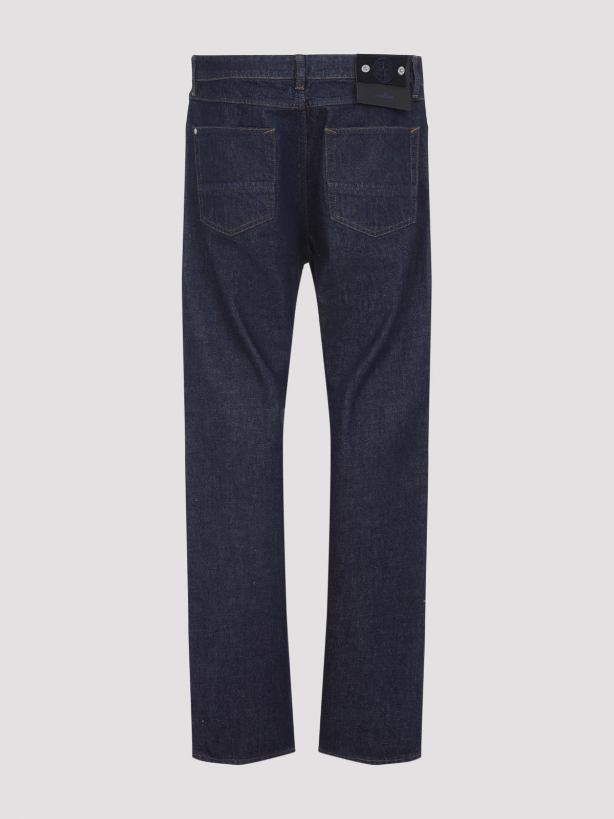 ストーンアイランドのストレートブルーコットンジーンズ。ブルーコットンデニム製、ベルトループ、5ポケット構造、フロントボタンとフライジッパー、バックウエストにロゴパッチ、ストレートレッグ。