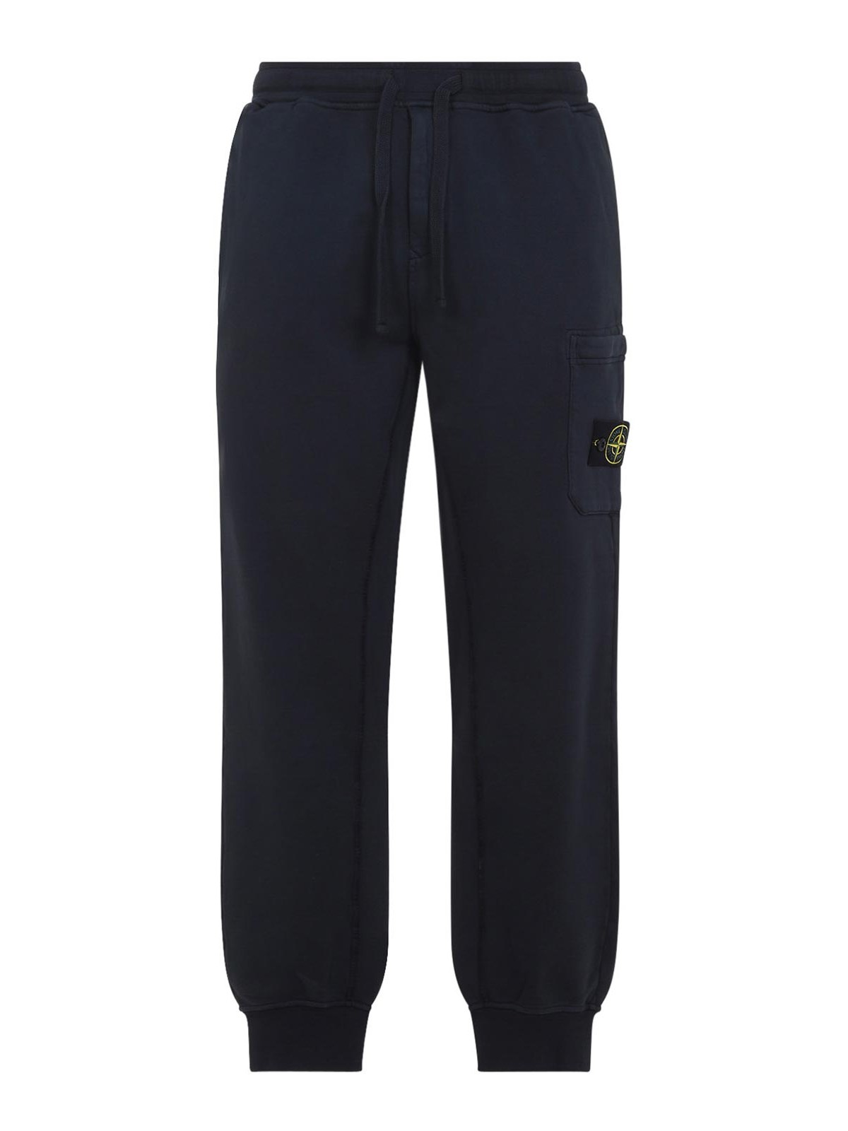 ストーンアイランドネイビーブルーコットンスウェットパンツ。ネイビーブルーコットン、伸縮性のあるドローストリング留め、ストレートレッグ、3ポケットスタイル、サイドにシグネチャーロゴパッチ付きのカーゴポケット、伸縮性のある袖口。