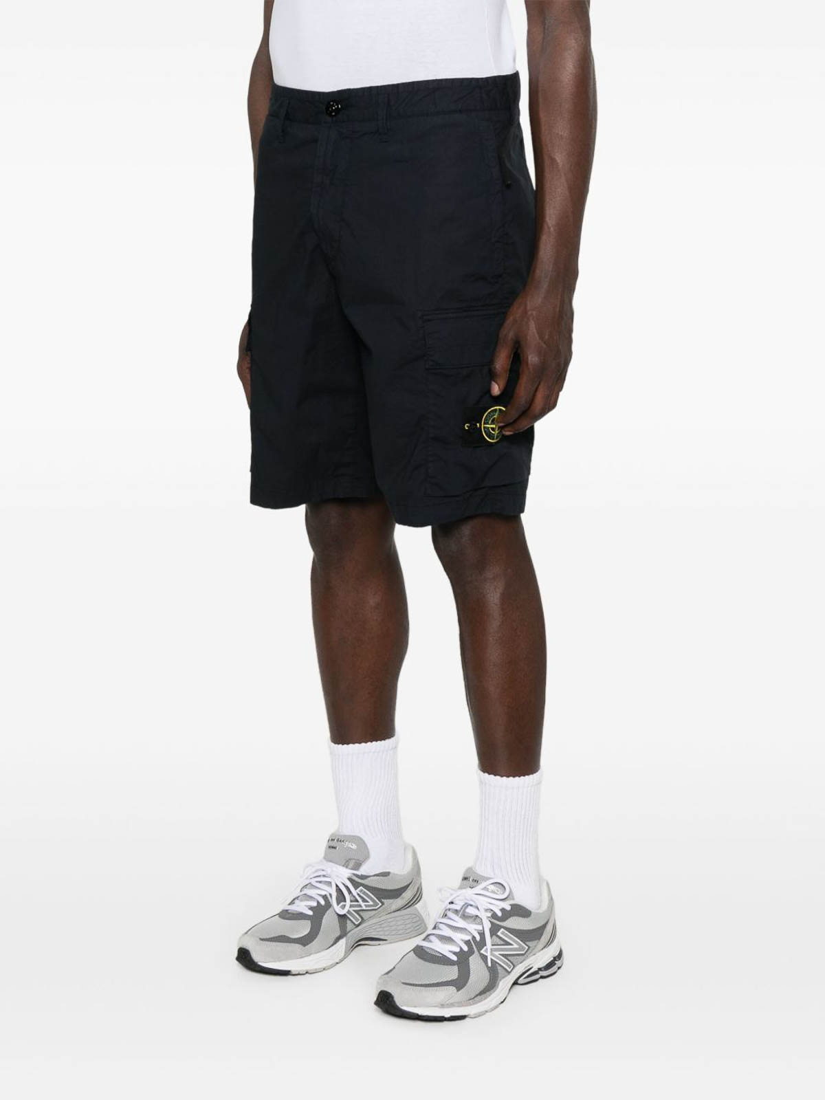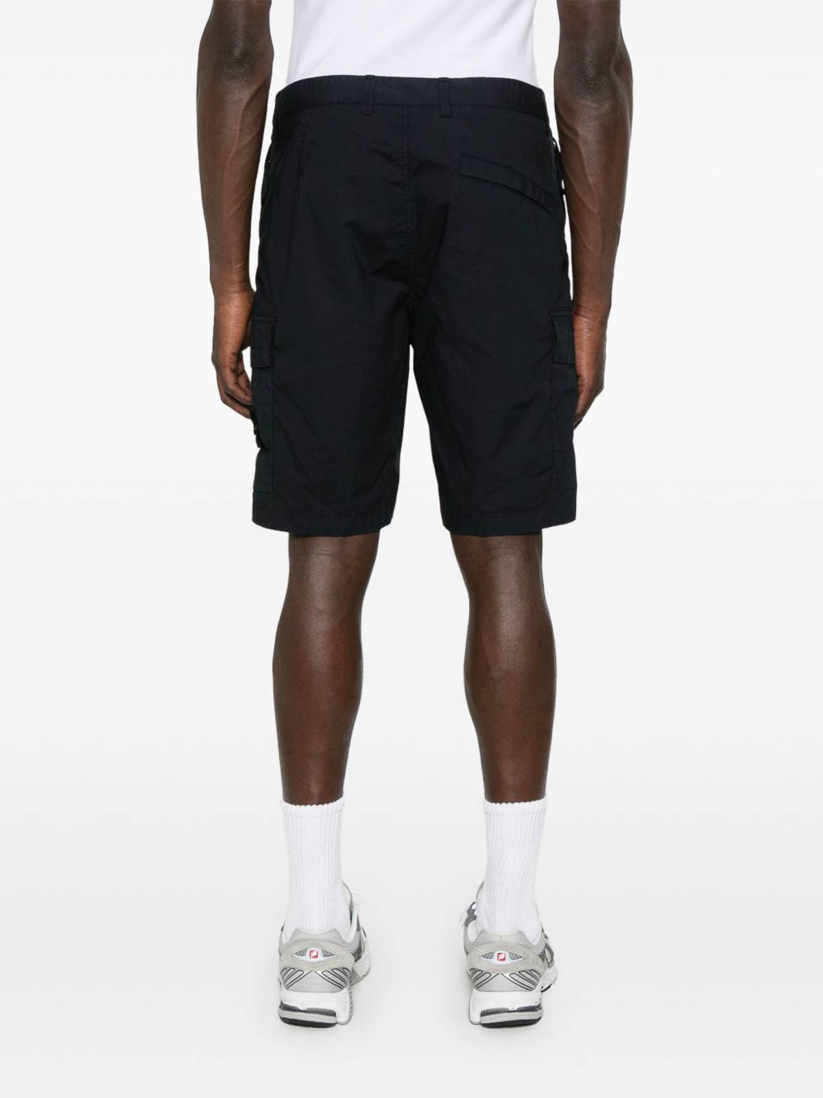 ストーンアイランドのショーツは、ネイビーブルーのストレッチコットン製で、隠しジッパーとボタン留めが付いています。ジッパー付きサイドポケット2つ、レギュラーサイドポケット2つ、リアウェルトポケット1つが特徴で、機能性と快適さ、現代的なスタイルを兼ね備えています。カジュアルにもアーバンスタイルにも最適で、プレミアム品質とブランド独自のデザインを備えています。