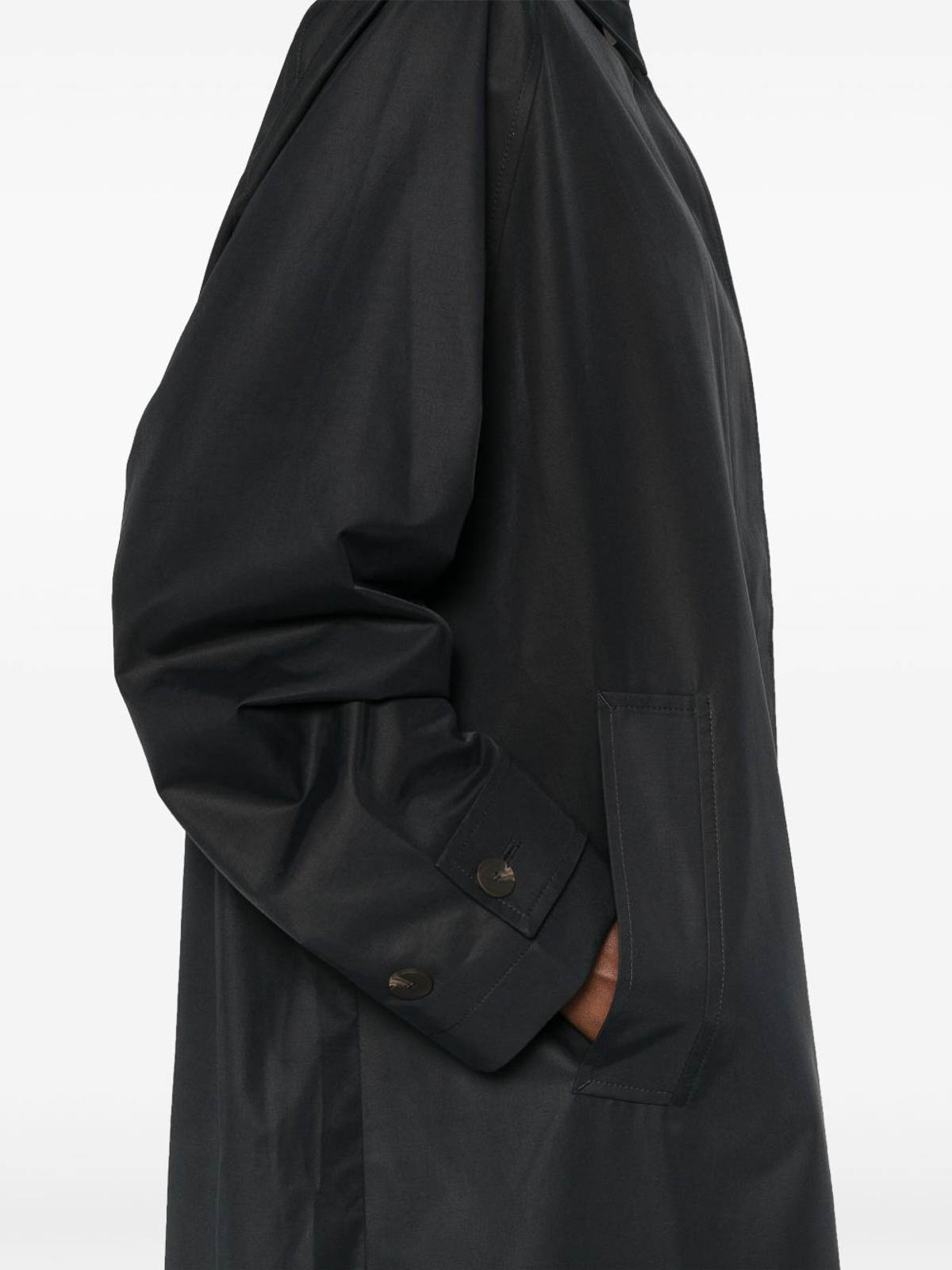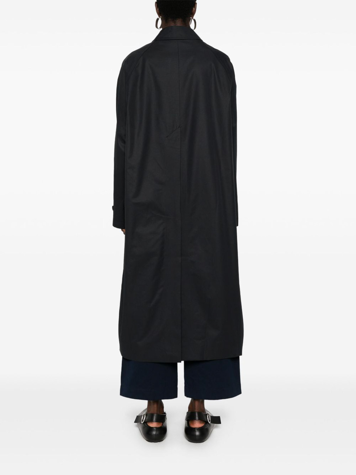 ミッドナイトブルーのコットン混紡ツイル織り隠しフロントボタン留め先のとがったフラットカラーロングラグランスリーブベルトカフス付きサイドウェルトポケット2つ、ボタン付き中央背面通気口内部パッチポケット全裏地ストレートヘムロングレングス