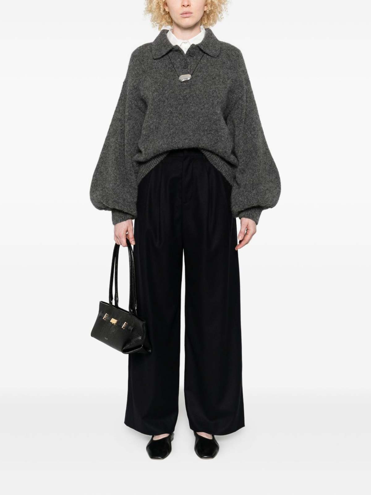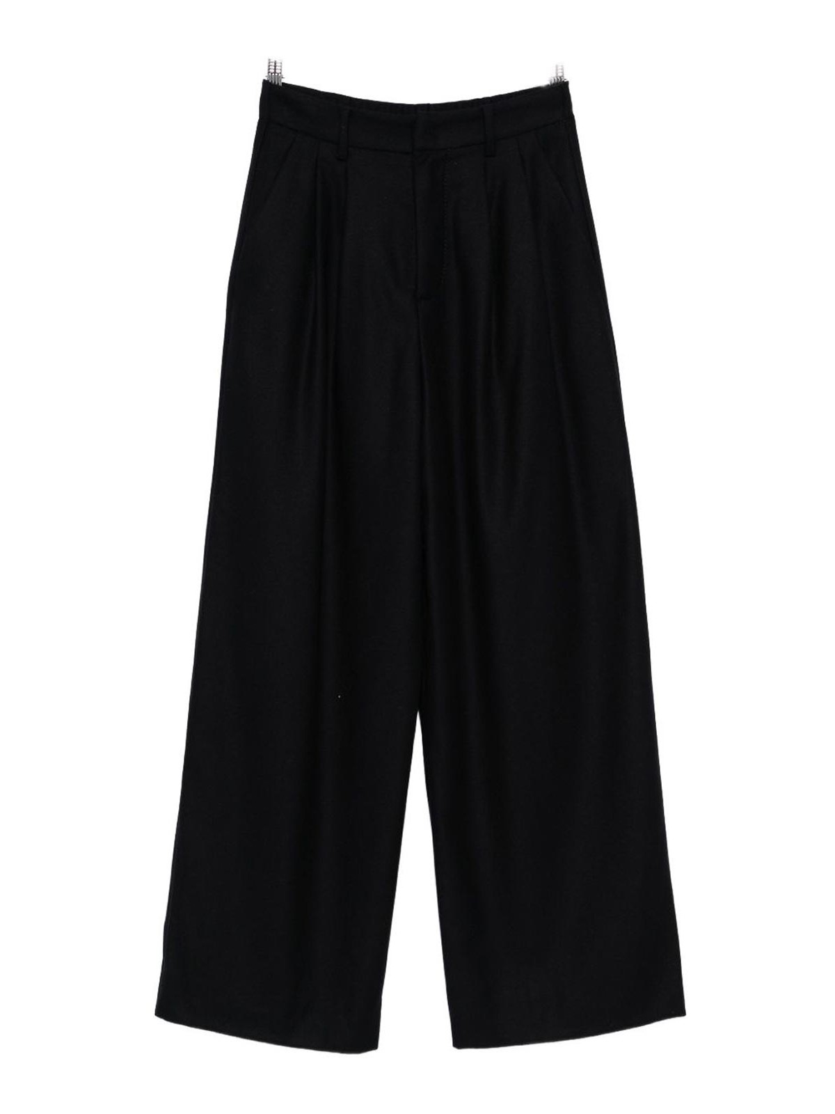 ブラックプリーツワイドレッグハイウエストストレートヘムブレンド