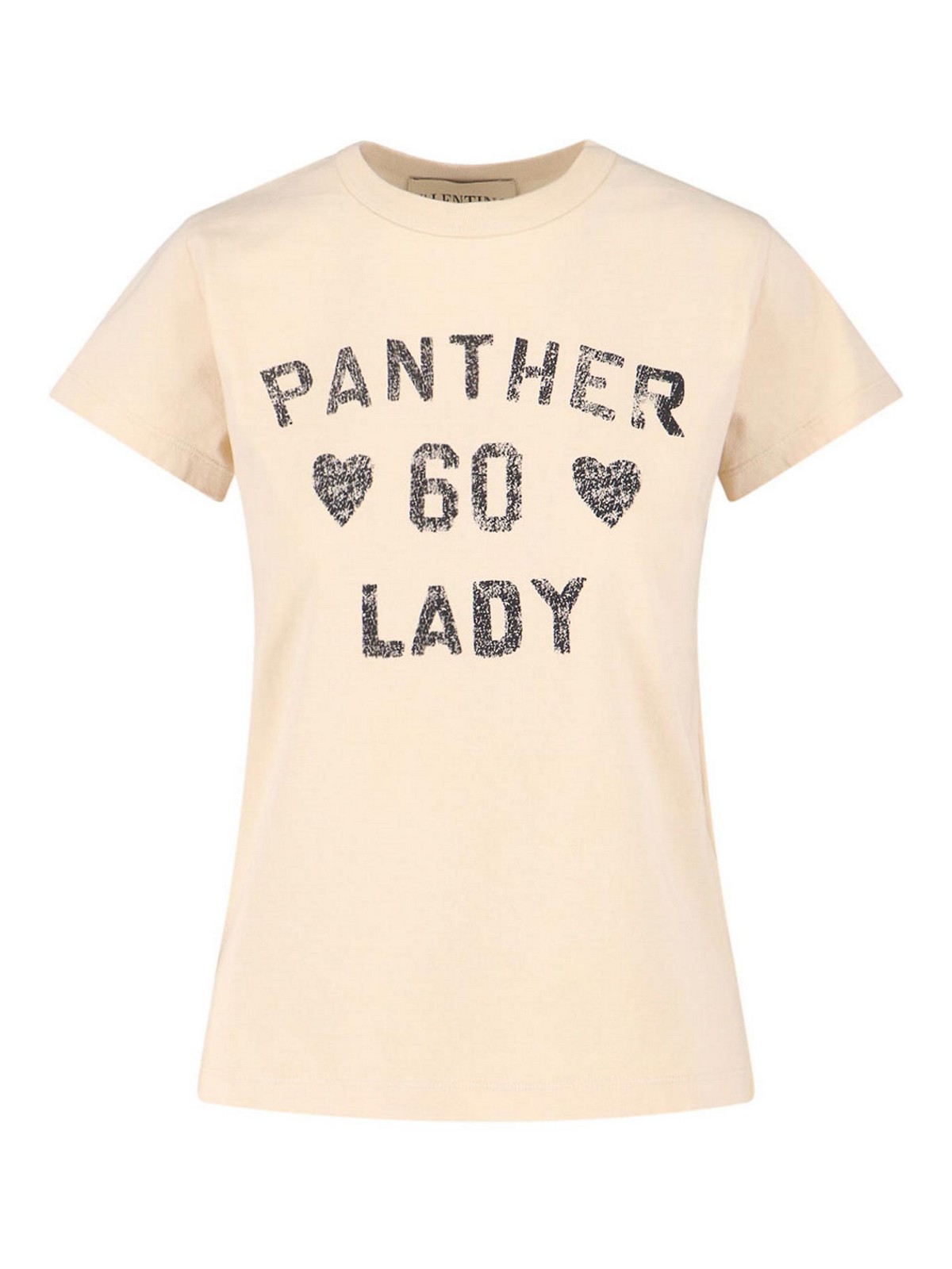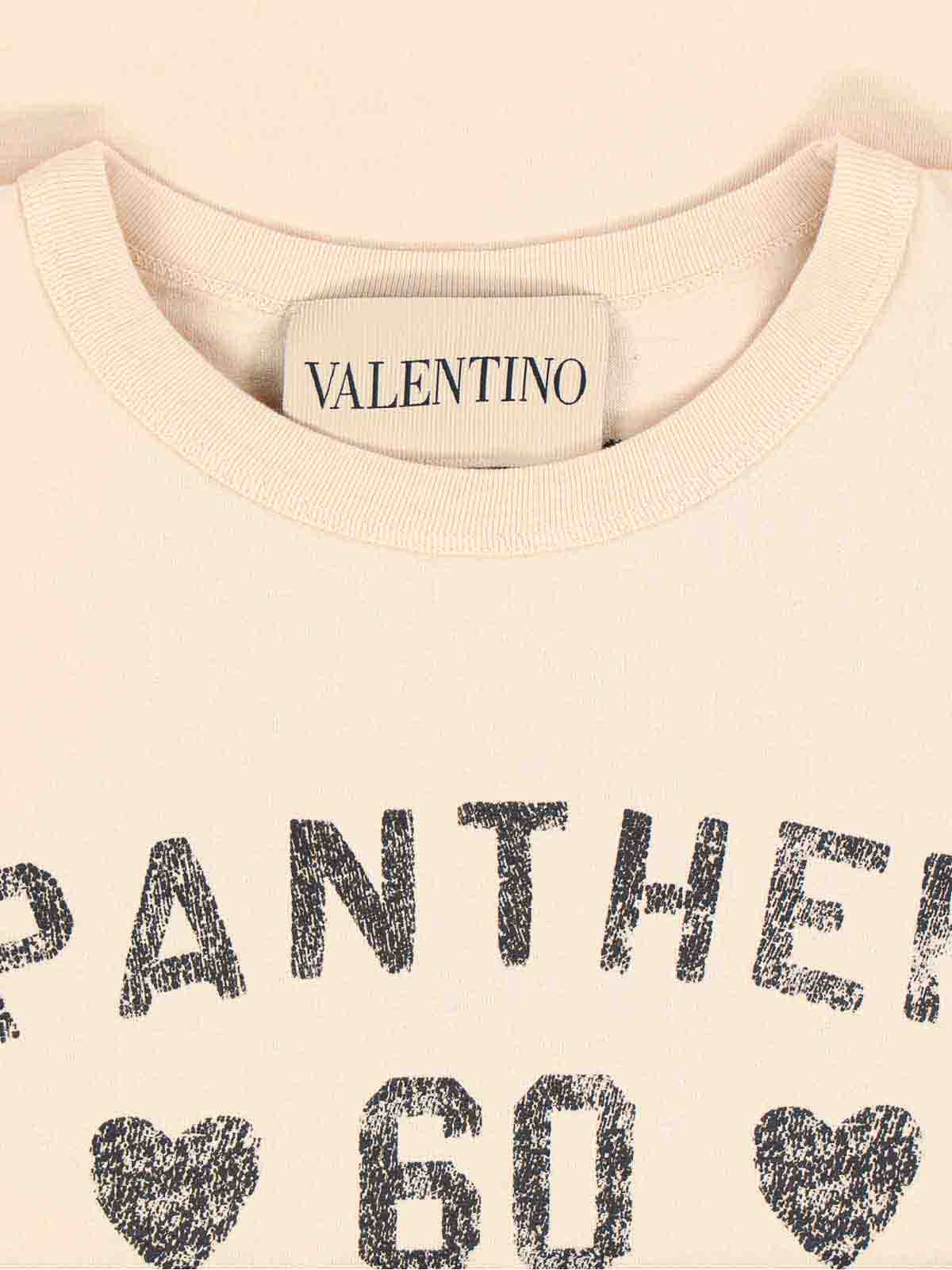 Valentino chez Tシャツ、クリームコットン、クルーネック、半袖、前面にグレーのウォーンプリント、背面にマキシクリームのロゴパッチ、ストレートヘム。