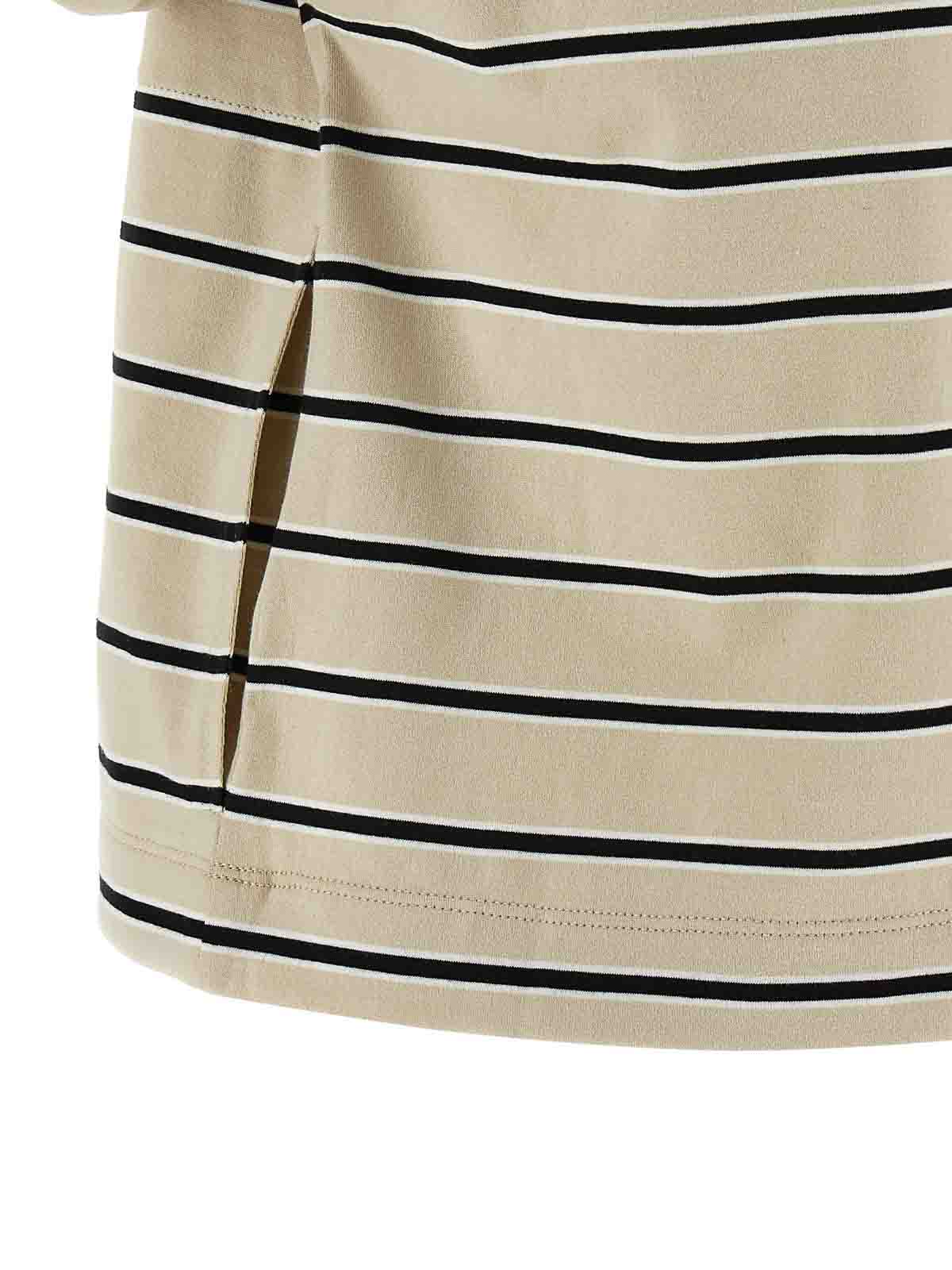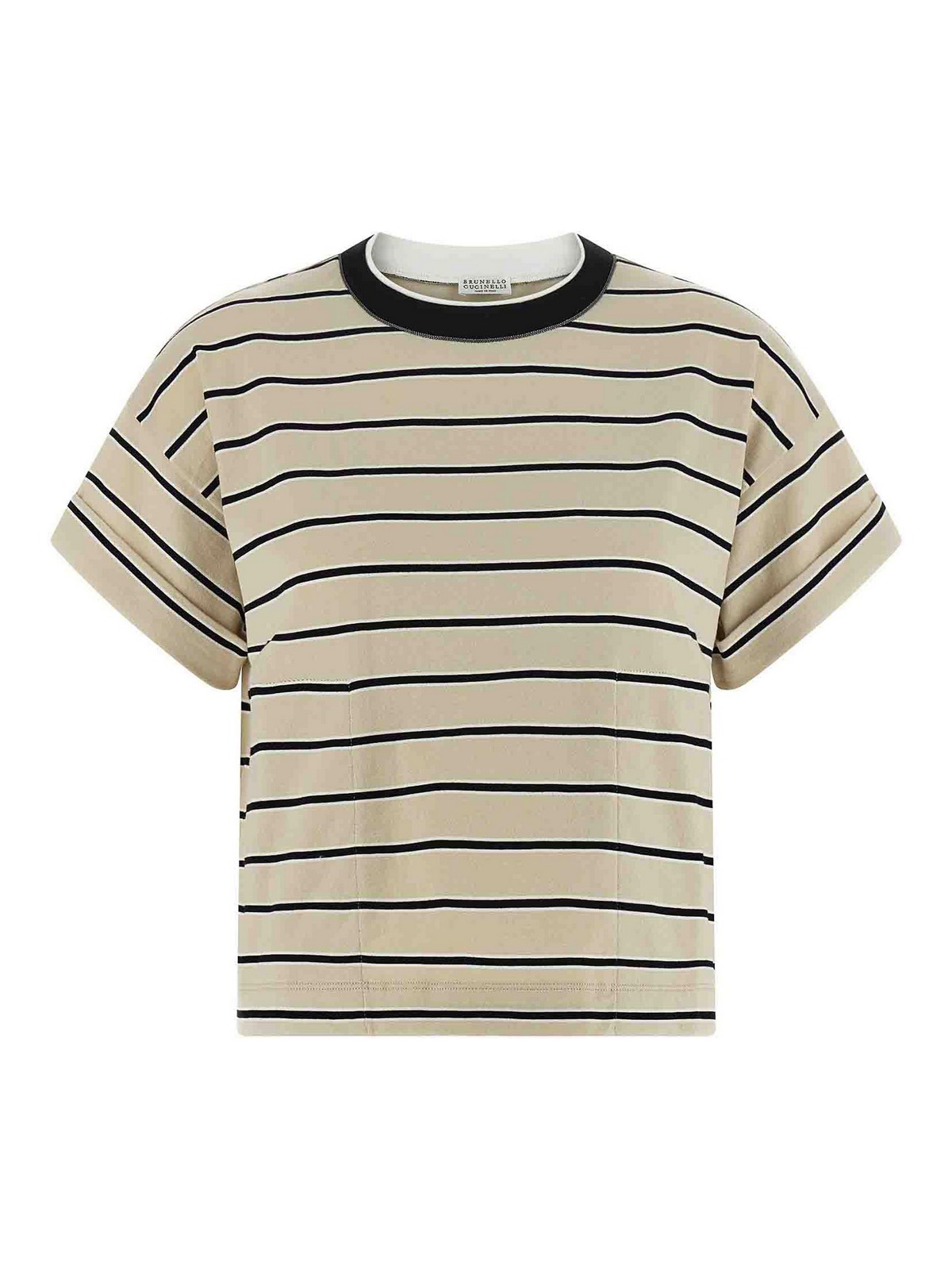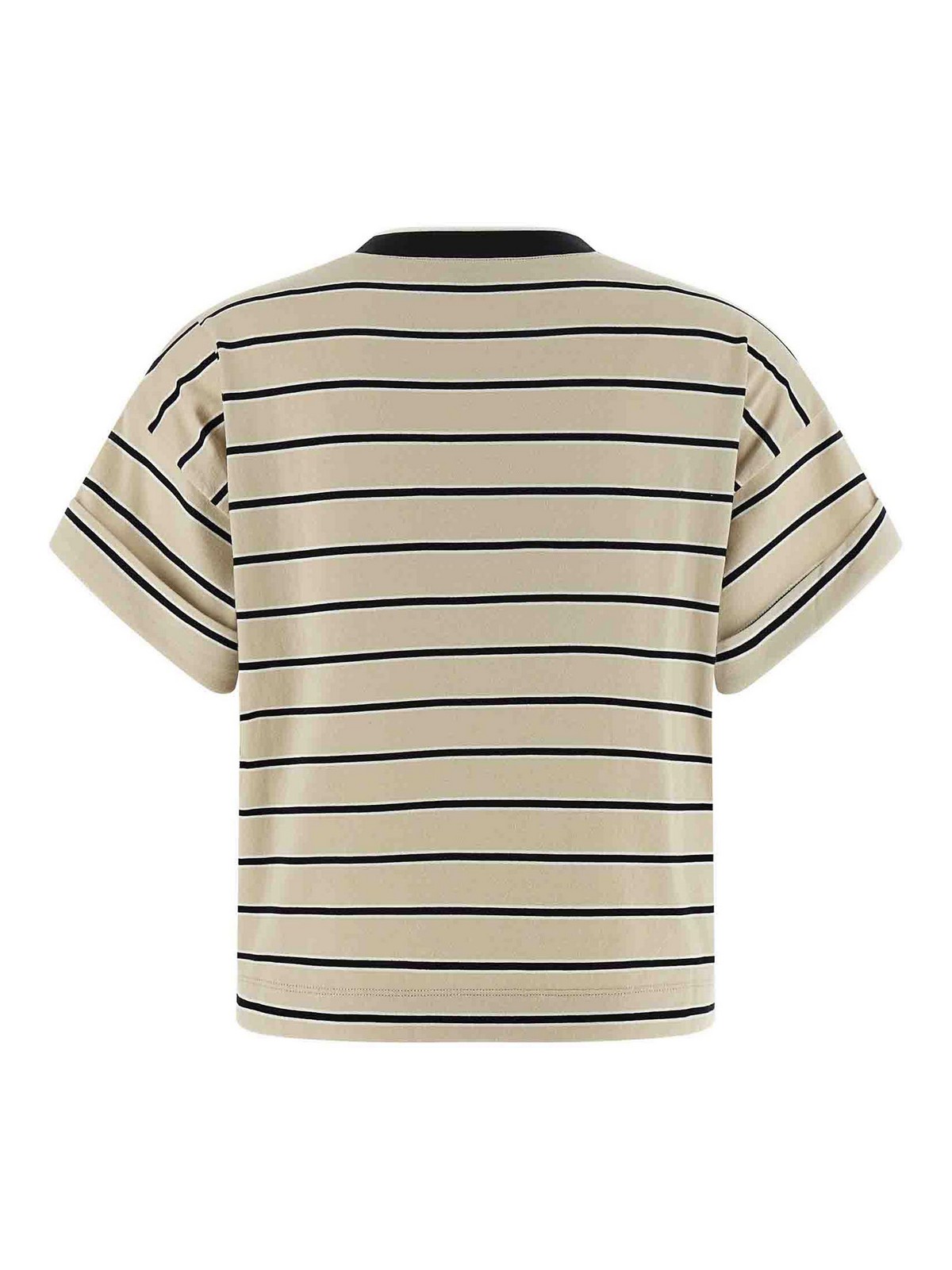 ストライプコットンジャージーTシャツ、少しクロップドモニール「シャイニートリム」のディテールをあしらったダブルレイヤークルーネック、袖口にターンアップをあしらったショートスリーブ、ポケット