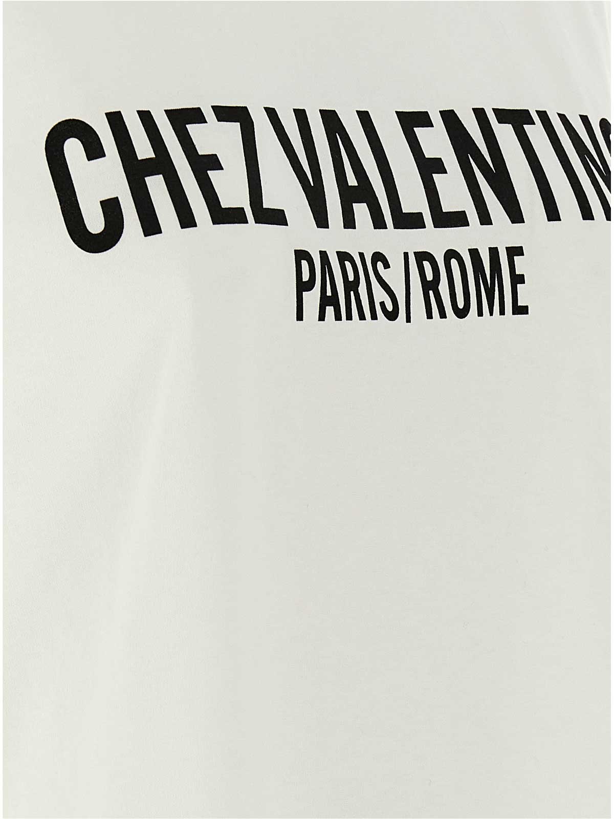 フロントに「chez valentino」のプリントをあしらったコットンジャージーTシャツ、クルーネック、ドロップショルダー付きのショートスリーブ。