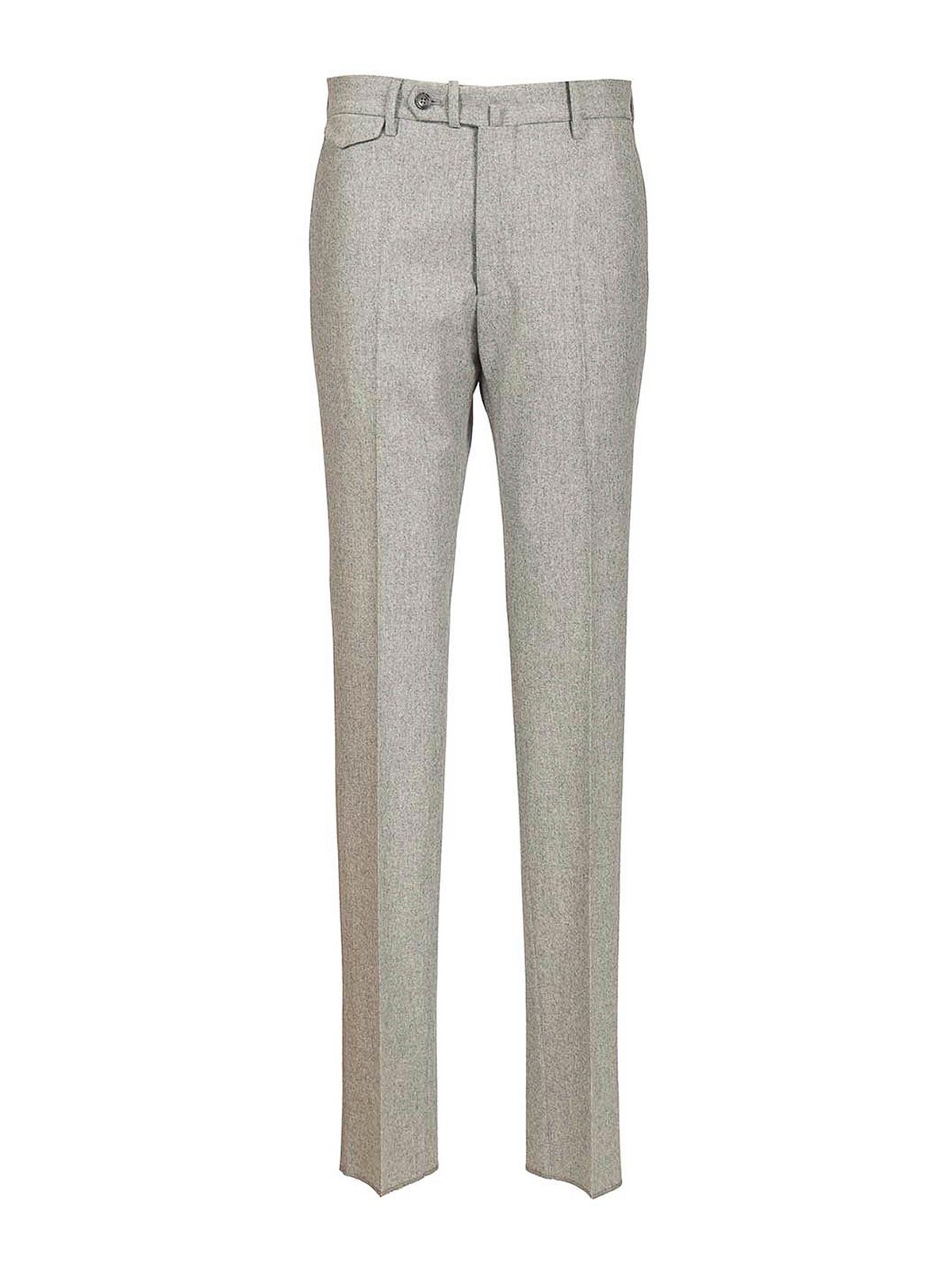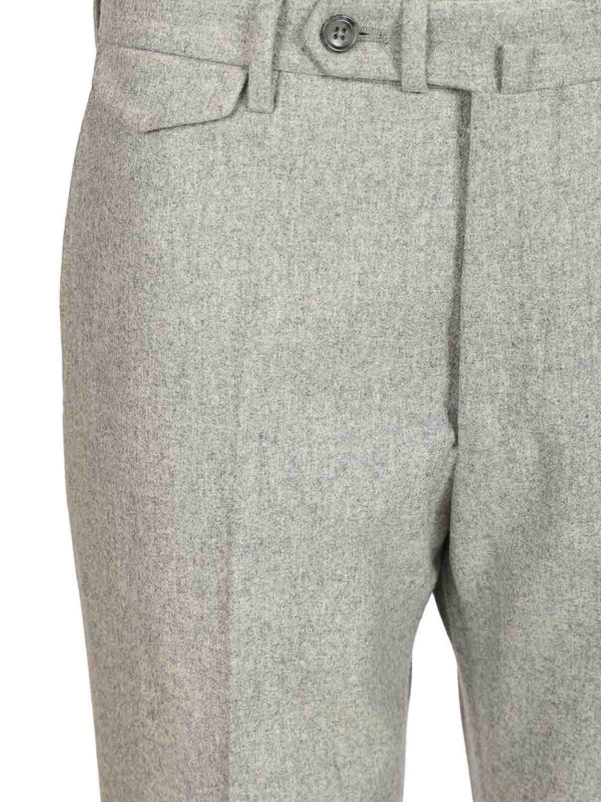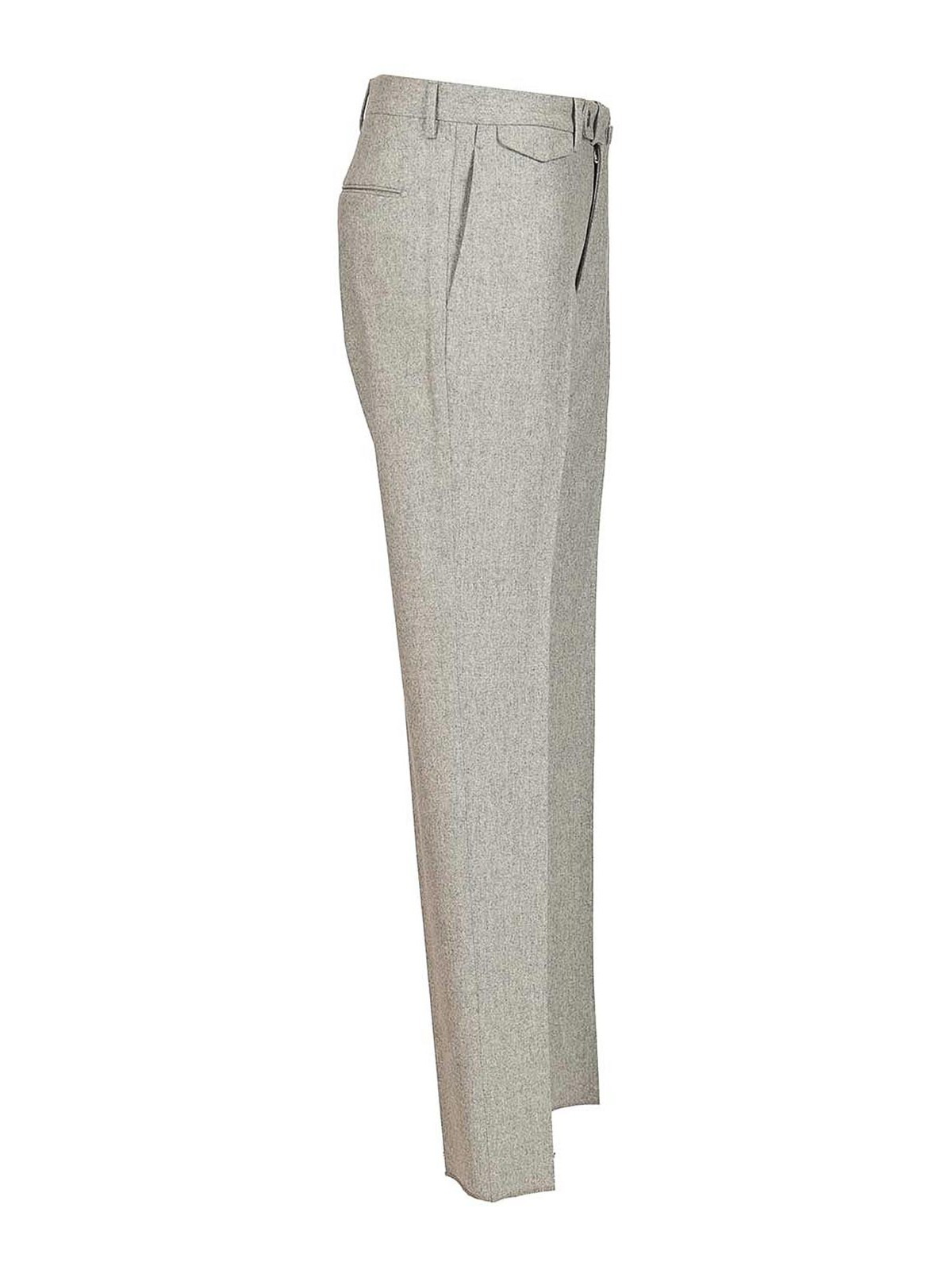 スーパー100年代ウールフランネルのプリーツ付きパンツ。バレルとジップファスナー、サイドウェルトポケット、バックウェルトポケット