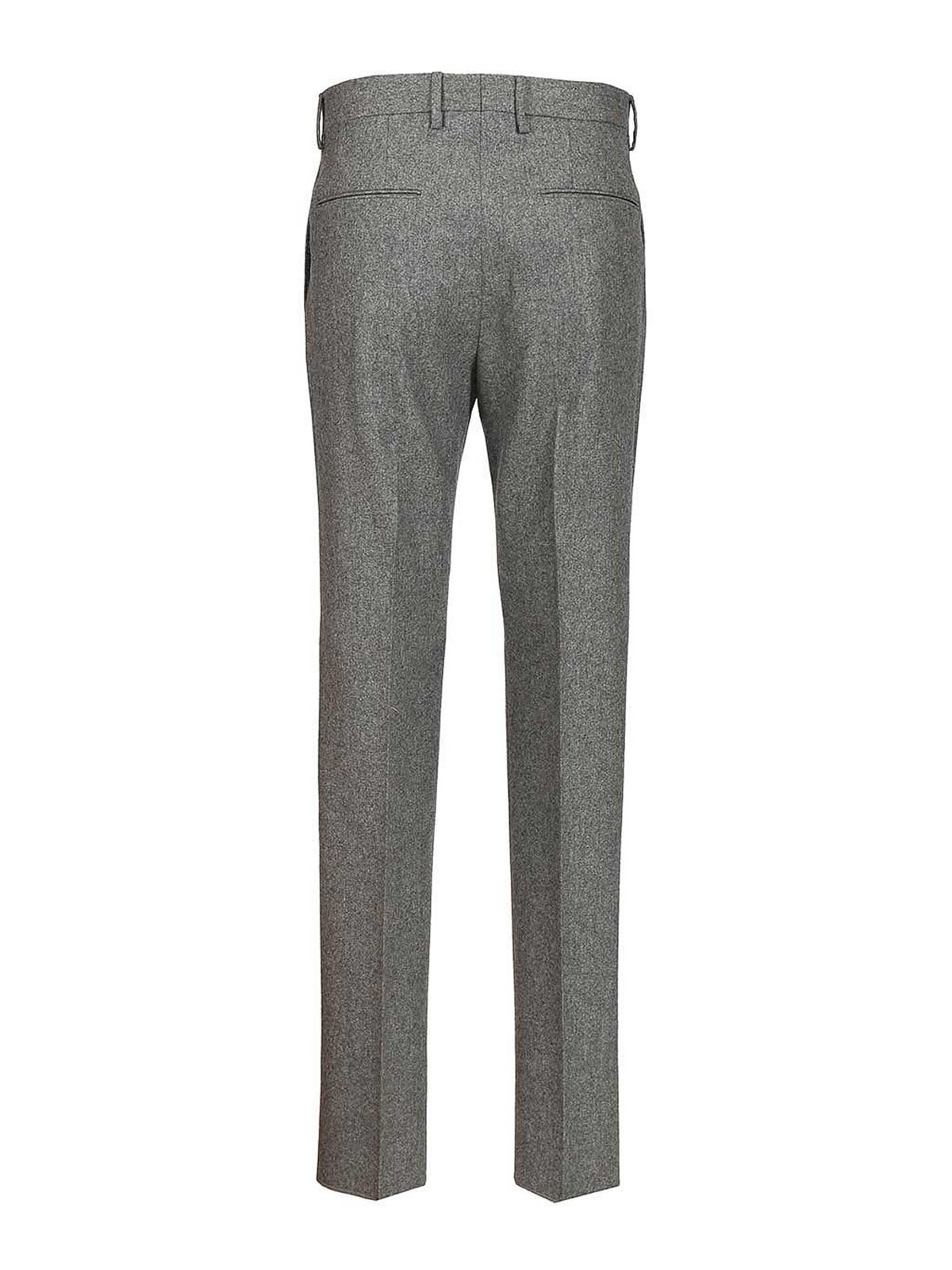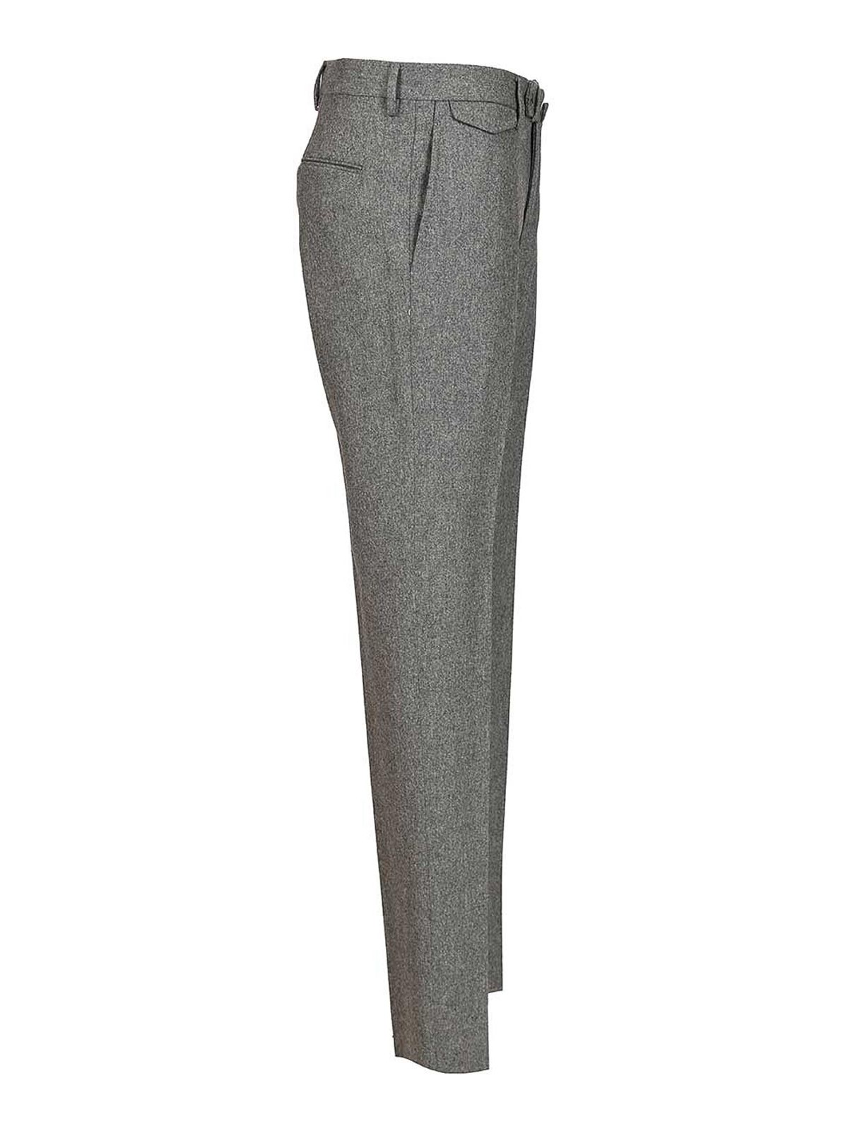 スーパー100年代ウールフランネルのプリーツ付きパンツ。バレルとジップファスナー、サイドウェルトポケット、バックウェルトポケット