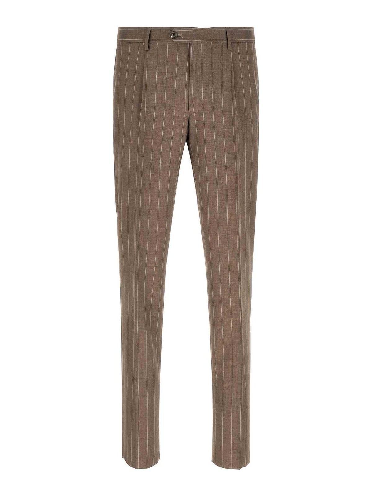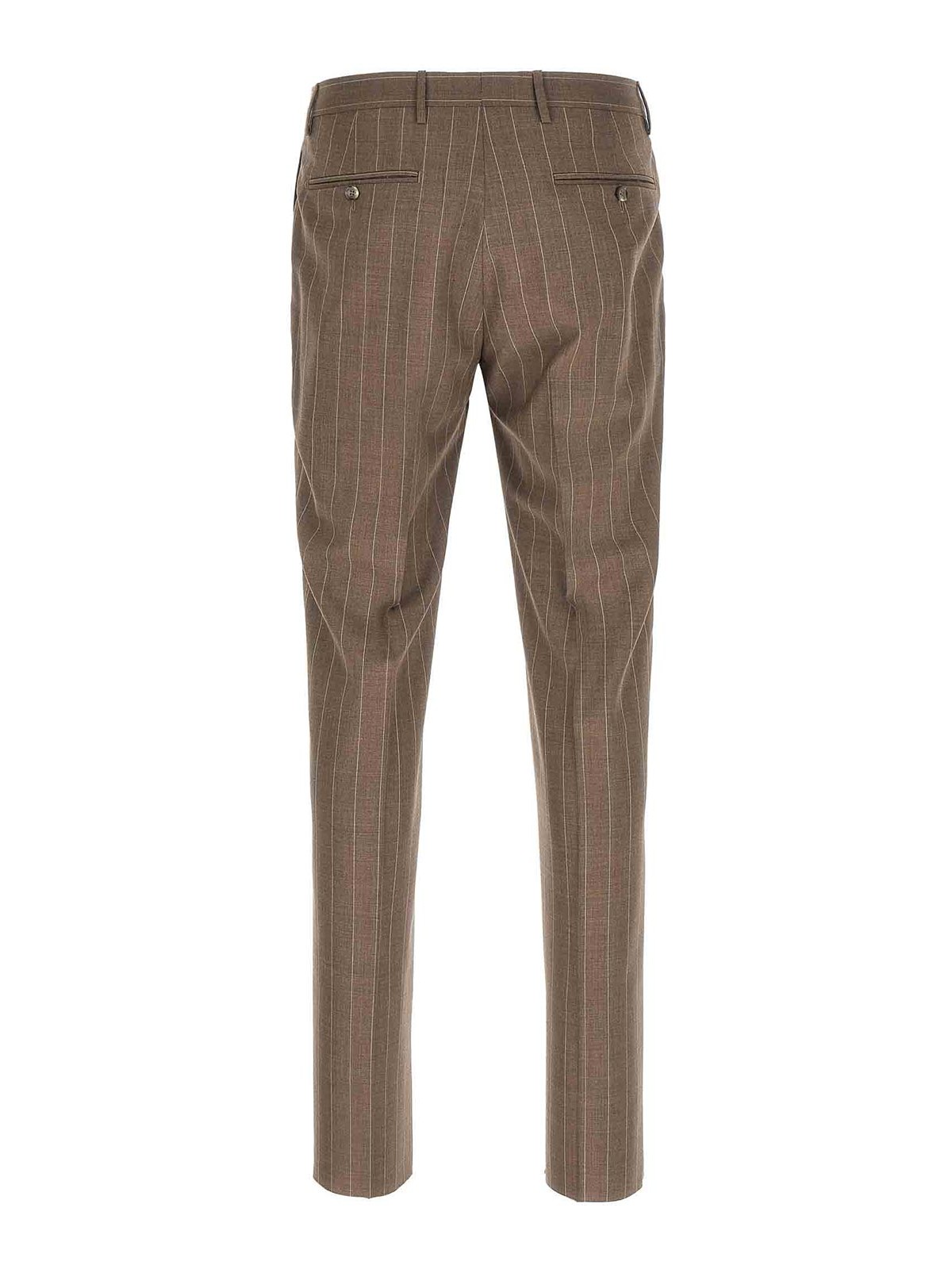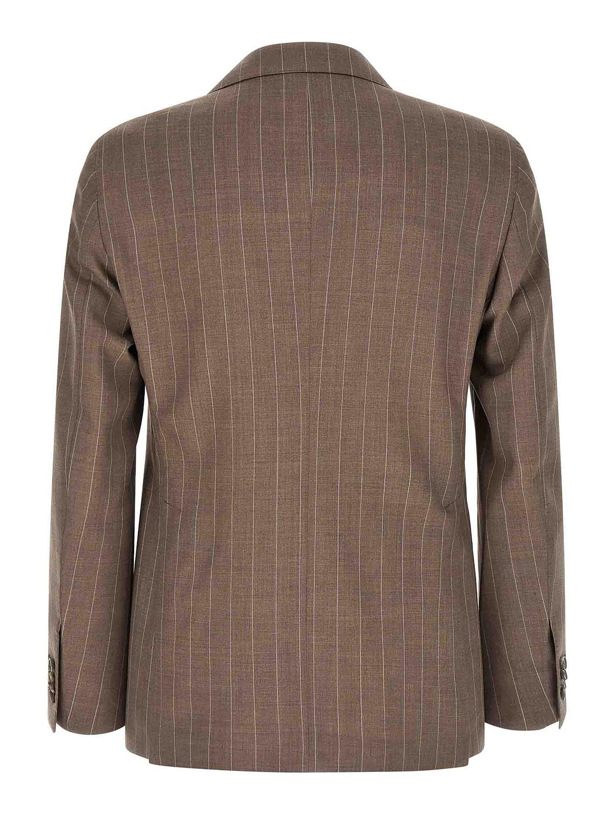 スーパー130のピンストライプのバージンウールドレスベスビオは、フロントボタン留め付きのダブルブレストブレザー、取り外し可能なメタルピン付きのピークラペル、胸ポケット、フラップポケット、キュプラ裏地、4つのインナーポケット、ボタンホールが開いた袖口、バックスリットとストレッチプリーツ付きのズボン、フロント「アメリカンポケット」、バックウェルトポケット、フロントジッパーとボタンクロージャー、コットン裏地で構成されています。