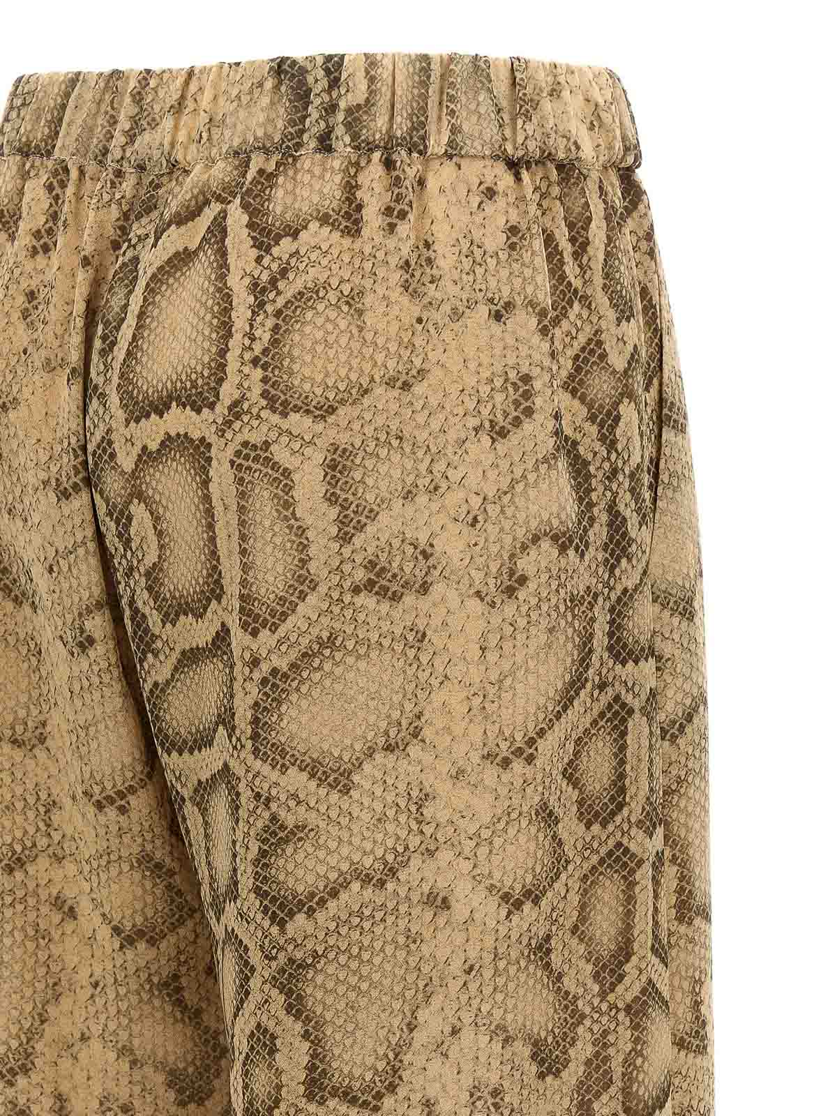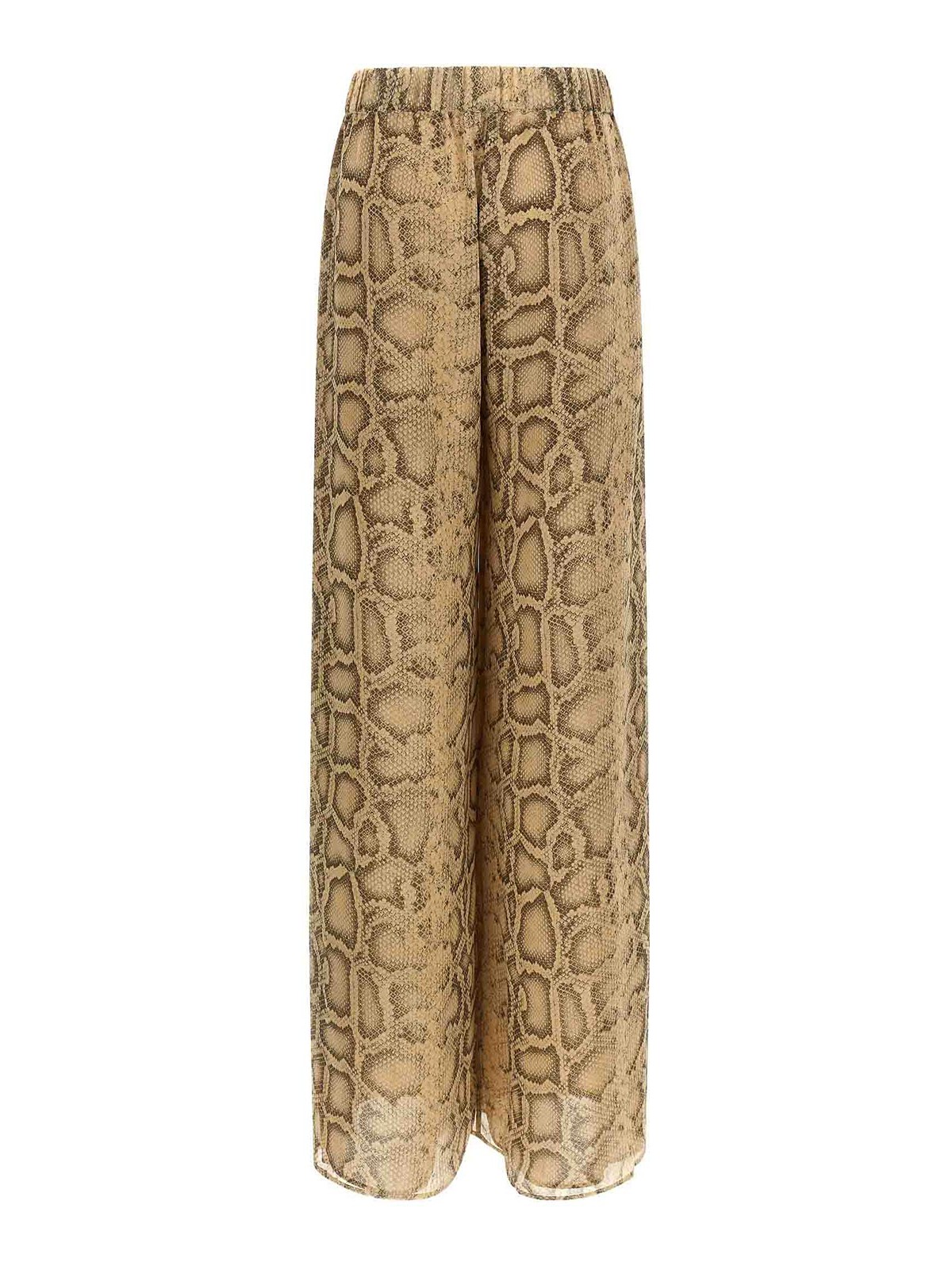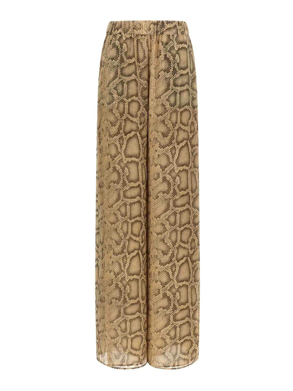 レナのパンツはナチュラルパイソンプリントのジョーゼット、中程度の伸縮性ウエストバンド、ワイドでストレートなレッグ、ポケット、裏地。