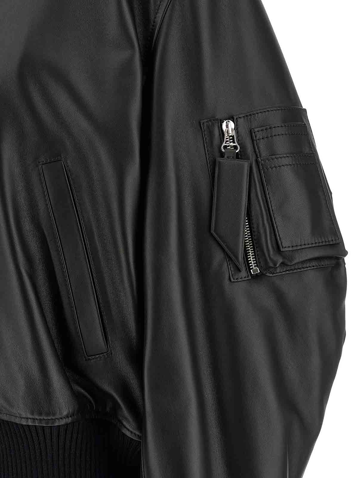 トーン・オン・トーンのリブ編みのストレッチニットのディテール、パッド入りの裏地、ハイネック、フロントファスナー、ポケット、カフスとドロップショルダー付きのロングスリーブ、ヘッドバンドをあしらったレザーボンバージャケット。