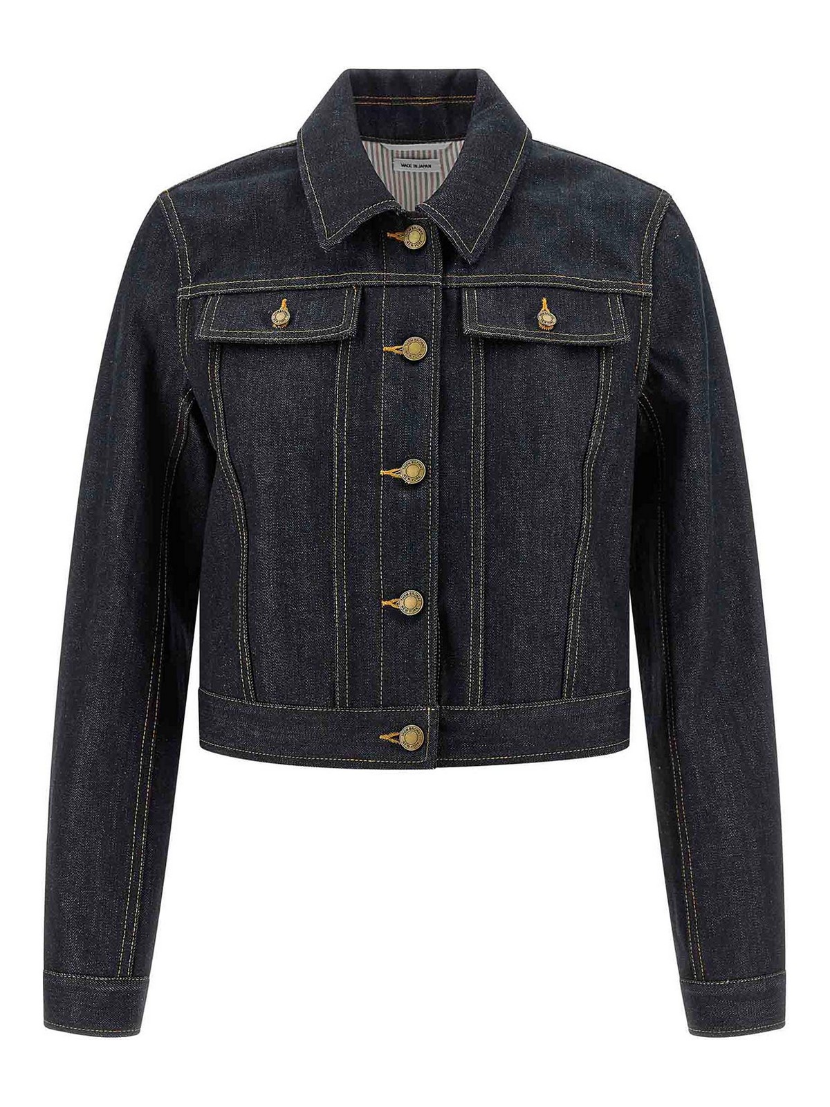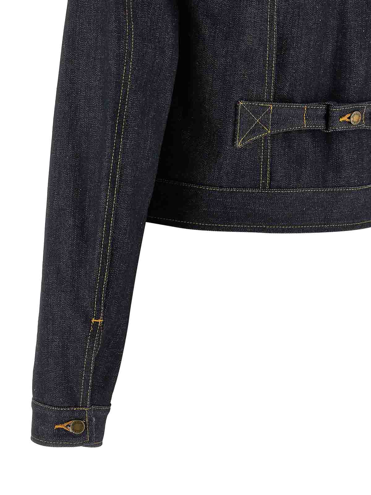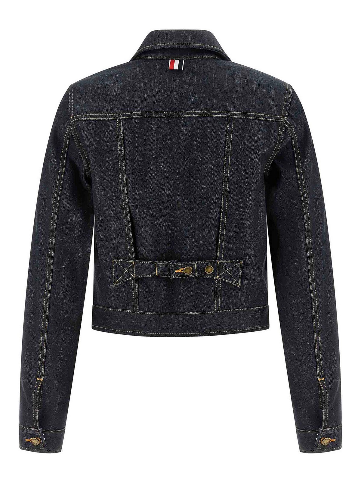 コントラストステッチ、クロップスタイル、シャツカラー、ボタン留め、ポケット、ロングカフスリーブ、グログランRWBリボンの裏地、後ろに調節可能なストラップが付いた日本製セルビッジコットンデニムジャケット。