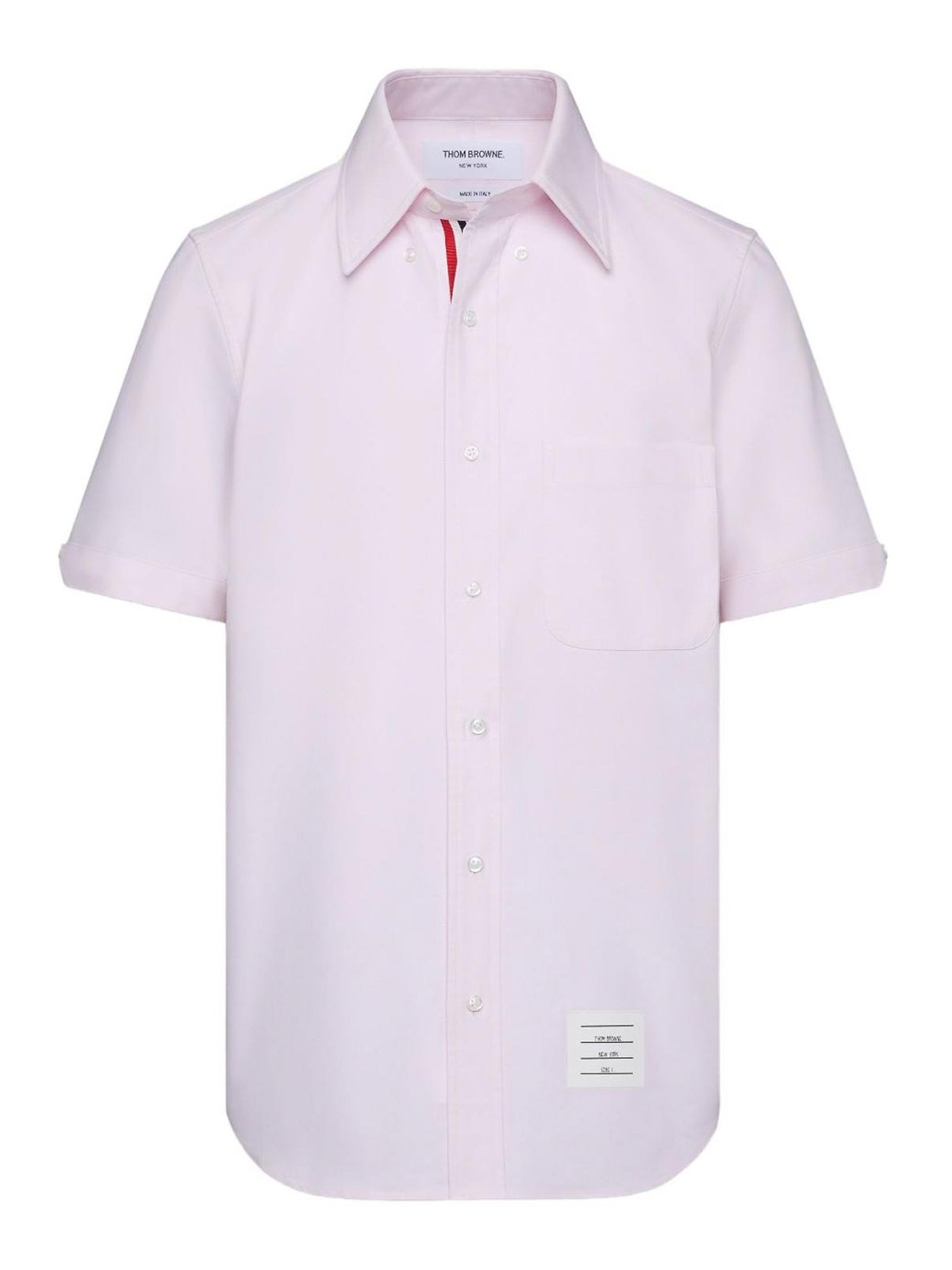 ピンク、ショートスリーブ、ボタン留め、ポロカラー、パッチポケット、ラベルアップリケ