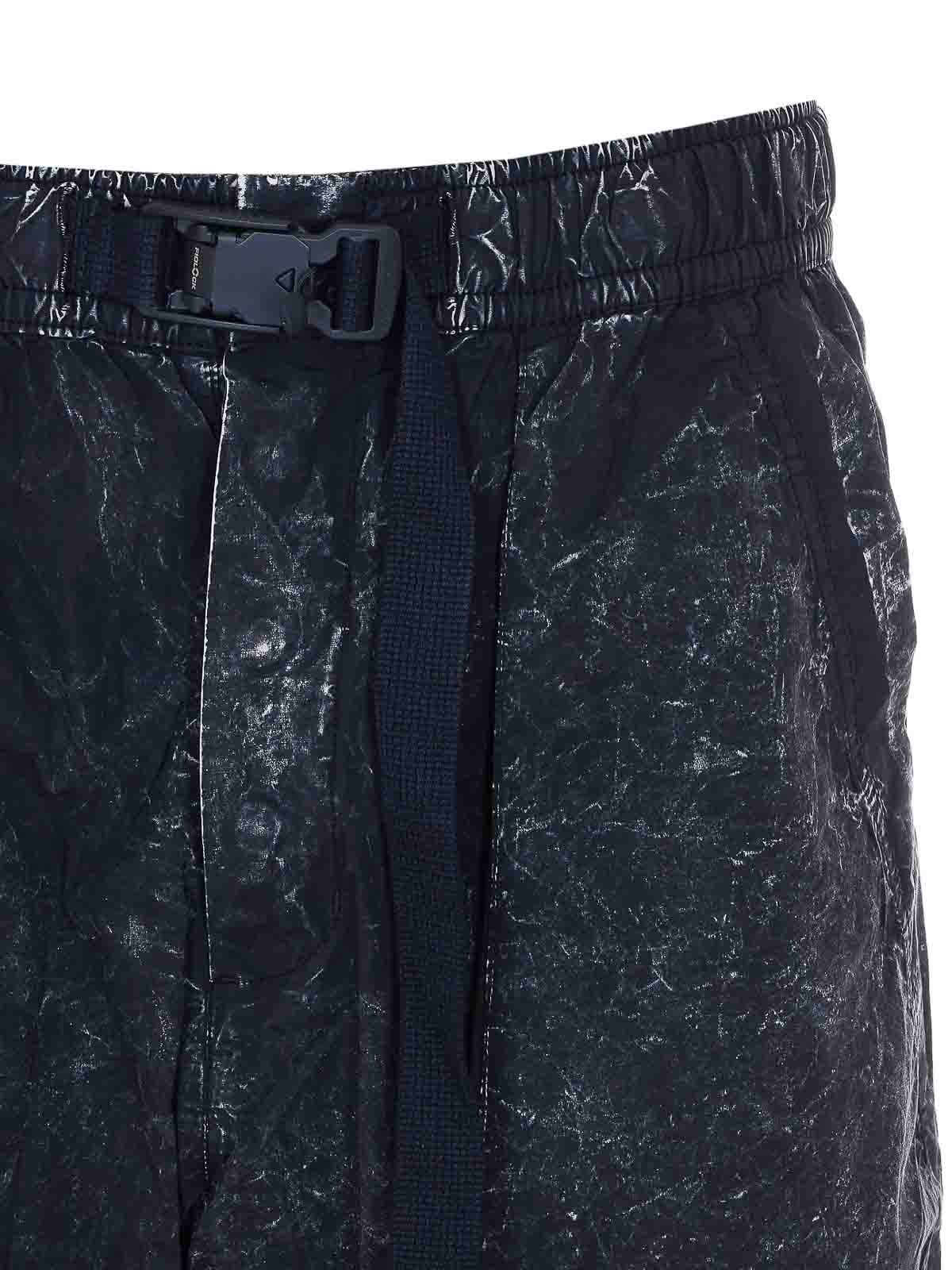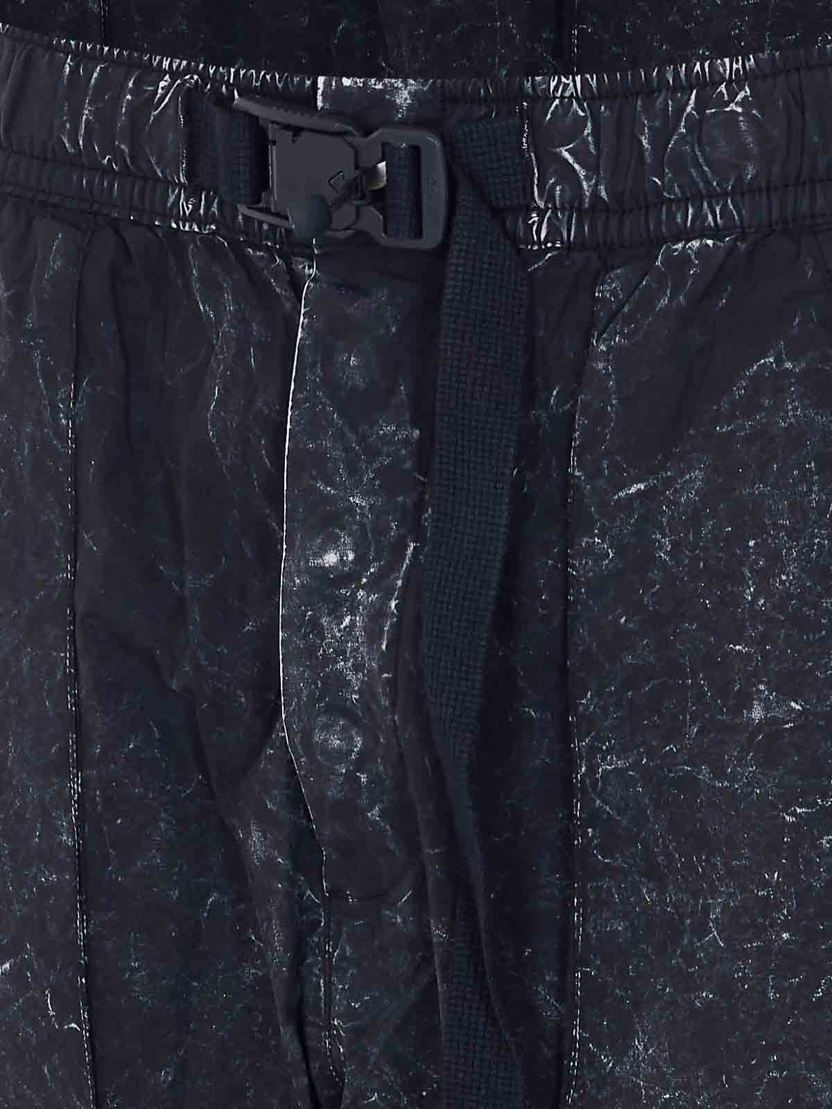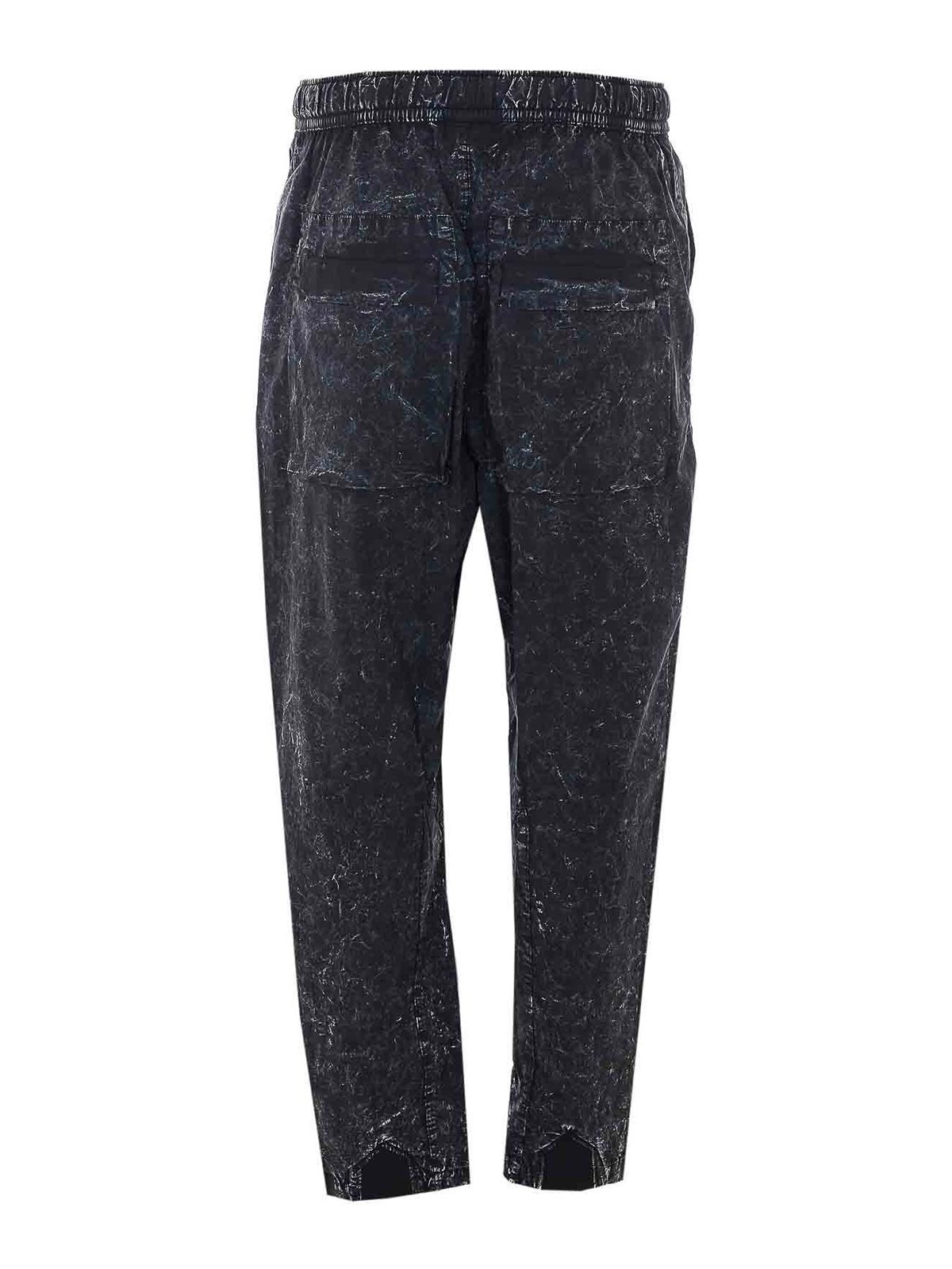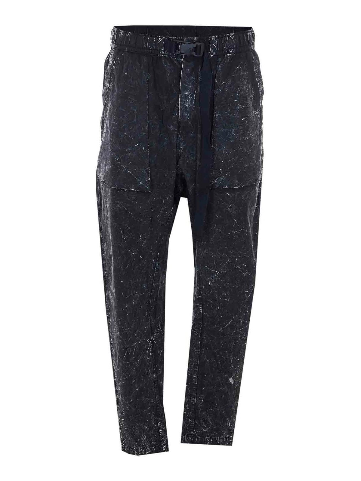 Thomkrom ブラックマーブルトラックパンツ、ボタン留め、ウエストゴム入り、バックル留め付きウエストベルト、横ポケット、ユーズドエフェクト