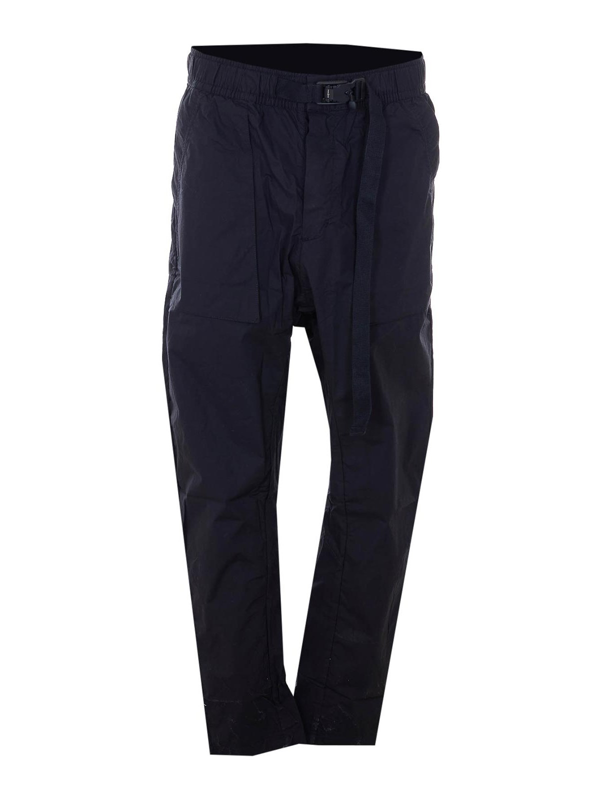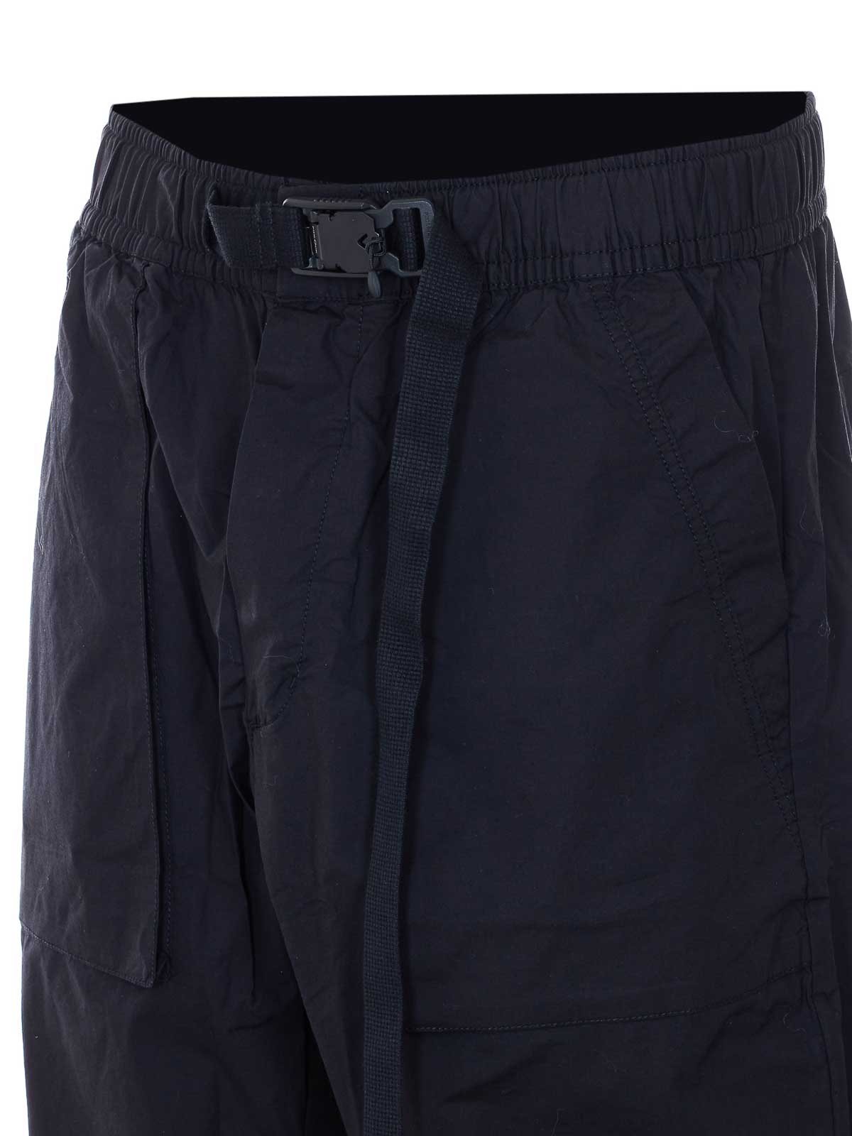 トムクロムのブラックトラックパンツ、ボタン留め、ウエストにゴム入り、バックル留め付きウエストベルト、横ポケット、ユーズドエフェクト