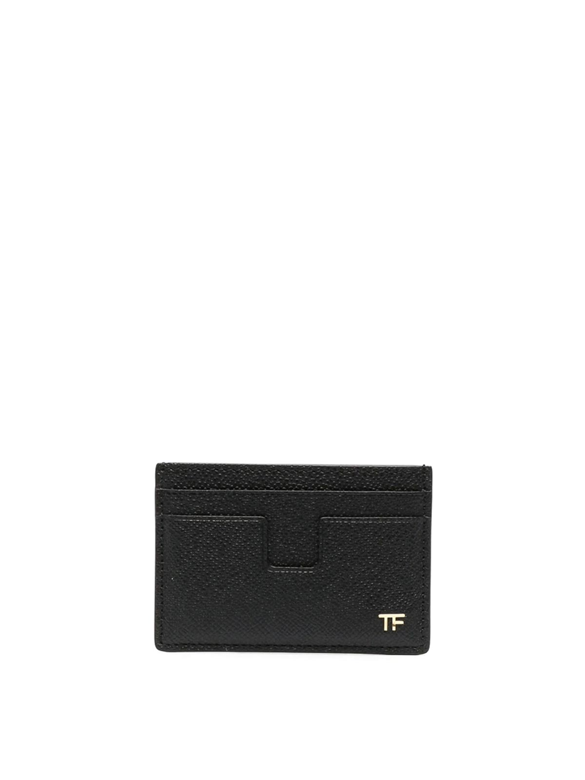 ブラックカーフレザーグレインテクスチャーマルチカードスロットゴールドトーンロゴプレートシグネチャー T ディテール