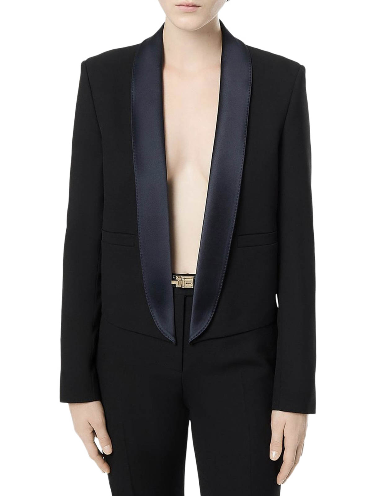 フロントクロージャーなしのシングルブレストデザイン、クロップドレングス、ワイドコントラストのショールラペル、滑らかな仕上がりのコンパクトな生地、サイドウェルトポケット、ストラクチャードショルダー、裏地付き、レギュラーフィット、100%ウール、色:ブラック/ネイビーブルー