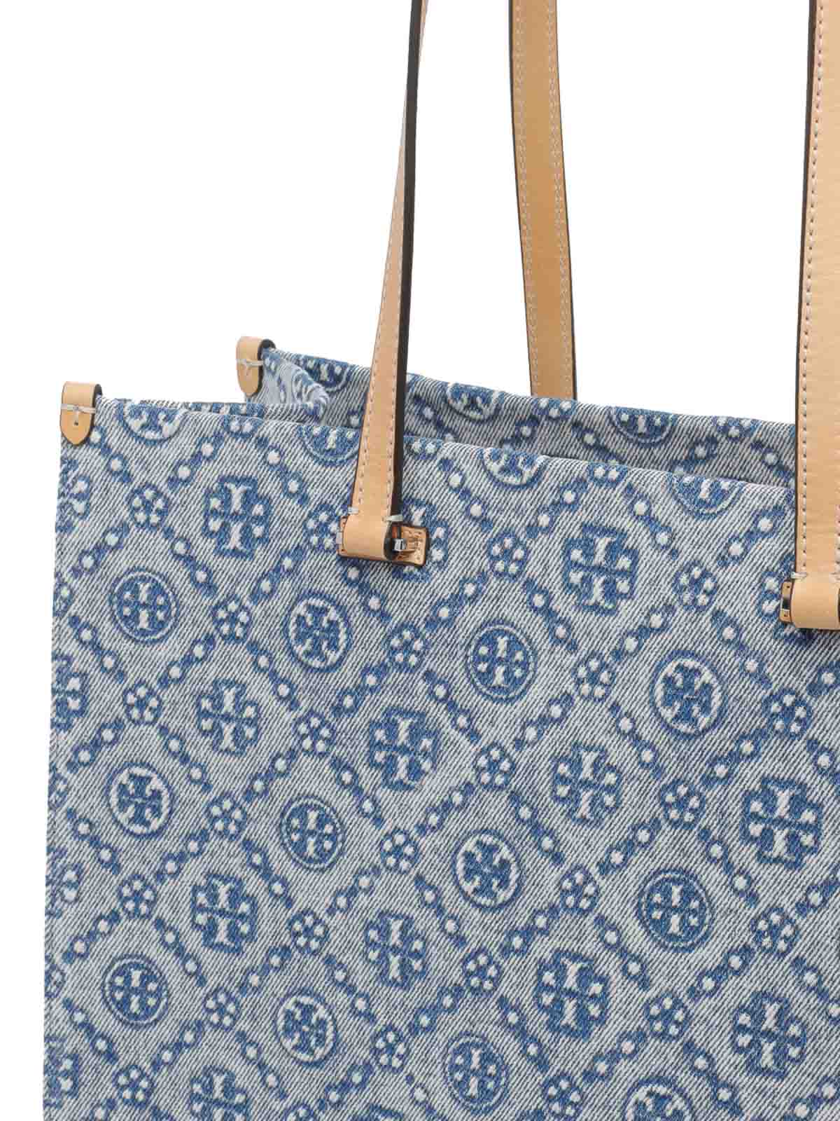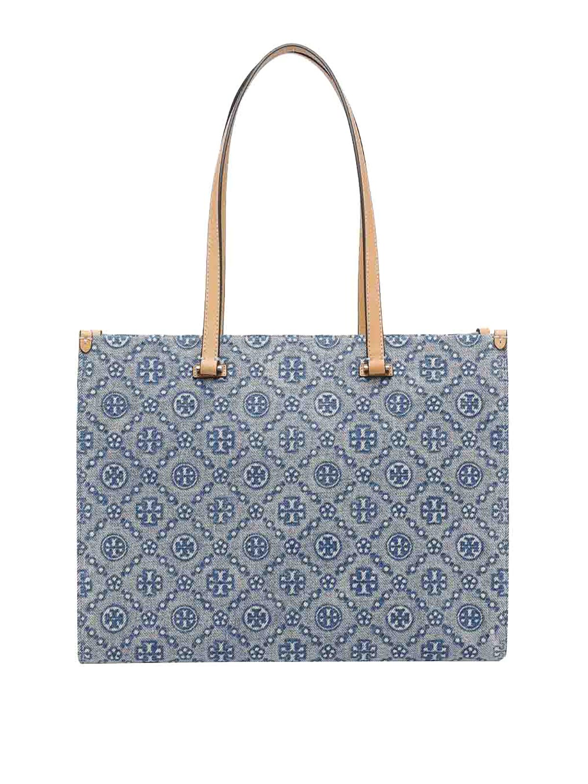 Tory Burch ブルー T モノグラムデニムトートバッグ、ラップトップ用インナーポケット、ファスナー付きオープンポケット、ショルダーストラップ2本、全面モノグラム
