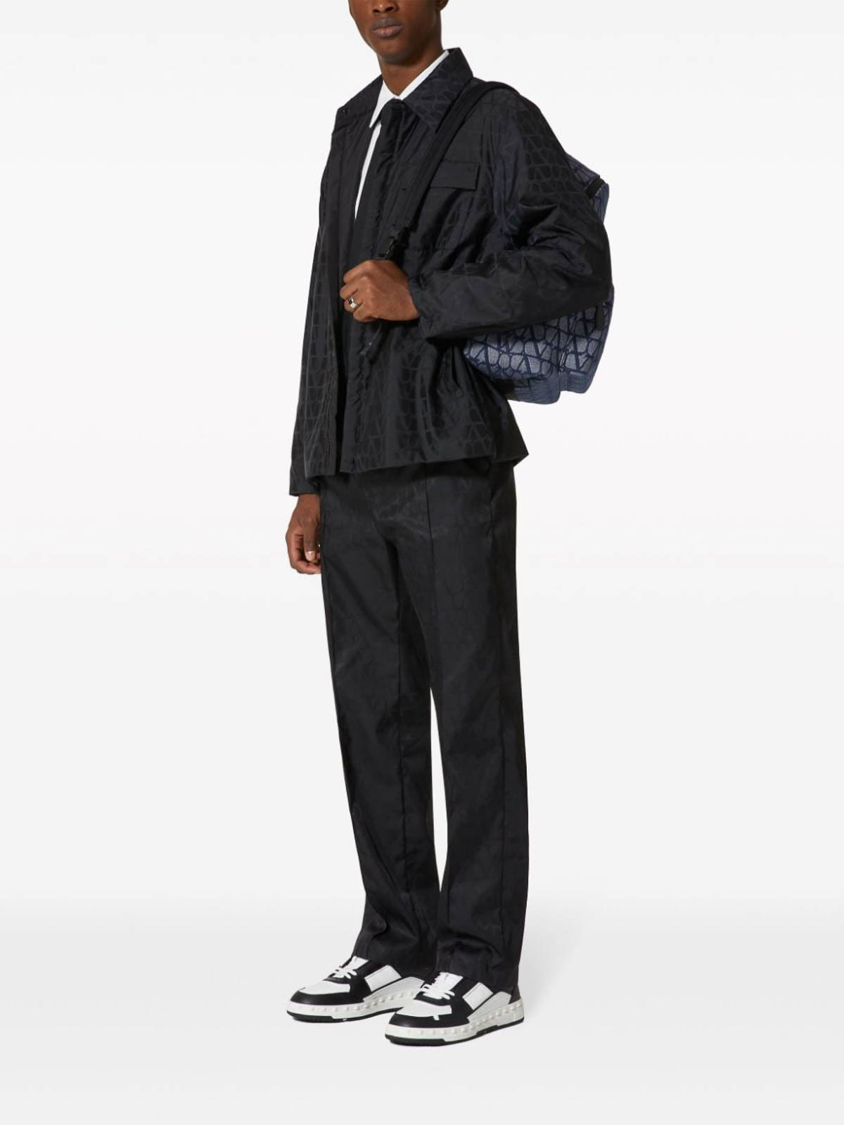 ブラックモノグラム柄 VLOGO シグネチャープレスクリース伸縮性ウエストバンド、後部にジェットポケット2つ、ストレートレッグ