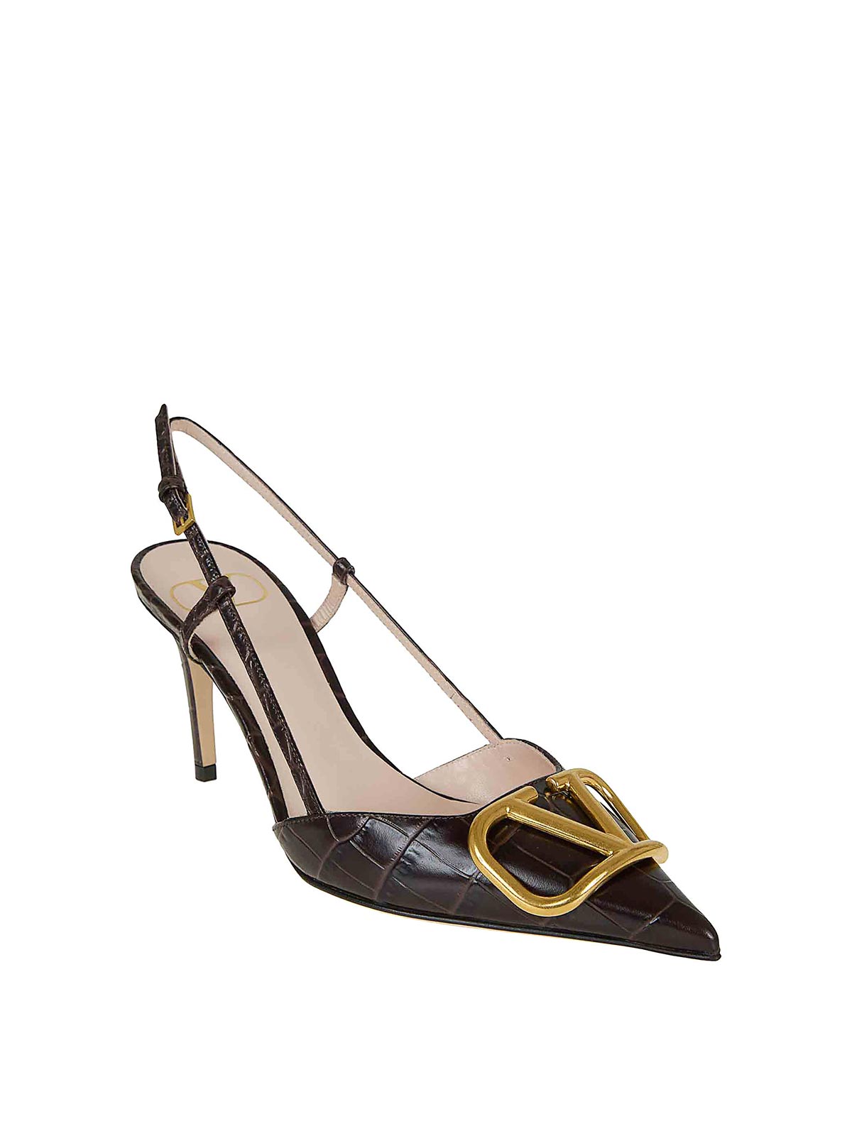 Valentino Garavaniによるクロコダイルエフェクトのプリントを施したカーフスキンのスリングバック。vlogoシグネチャーのアンティークエフェクトブラス仕上げが特徴。ヒールは8cm。