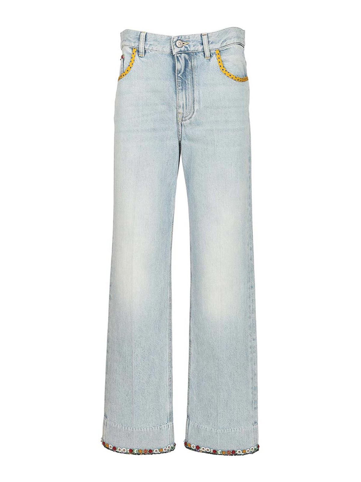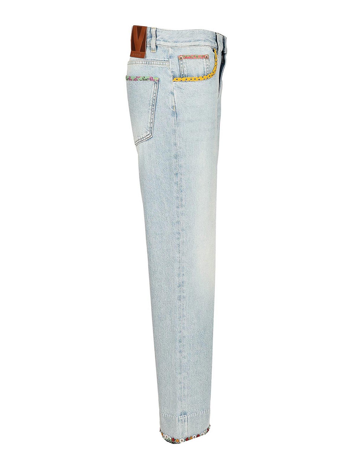 フラワートリムが刺繍されたデニムパンツ。ボタンとジッパー付きのフロントファスナー。