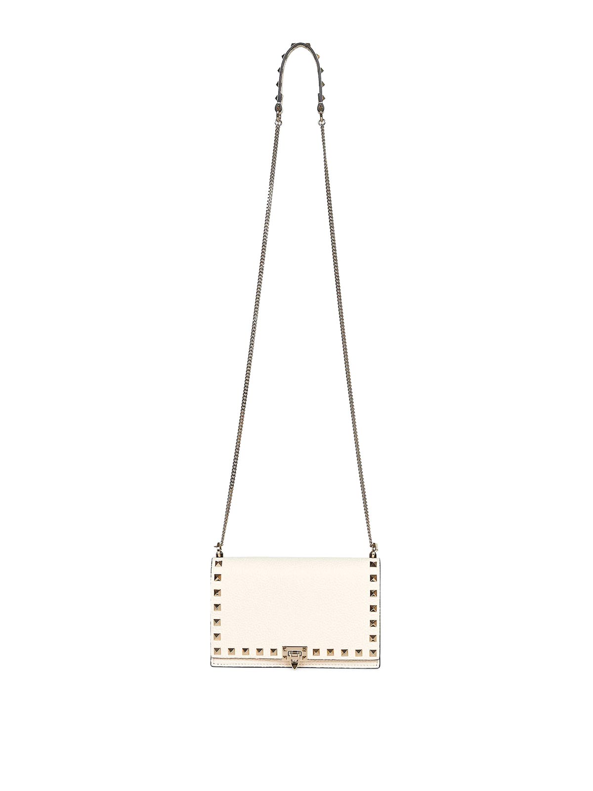 フック付きトップフラップ、調節可能で取り外し可能なチェーンショルダーストラップ、スタッズ付きショルダーパッド付き、背面の内側にはトーンロゴ、内側にトーンロゴ、メインコンパートメント1つ、ファスナーポケット1つ、カードスロット4つ、縁にスタッズのディテールが施されたプラチナ、仕上げスタッズ、ハードウェアグレインデザイン、マックスショルダーストラップカラー:アイボリー