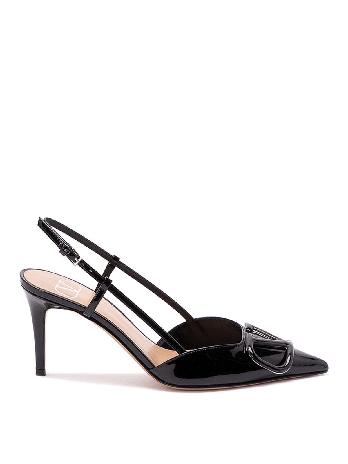ベーシックで洗練されたデザインのブラックレザー製VLogoシグネチャースリングバック。エレガントでフォーマルなルックスを完成させるのに最適です。