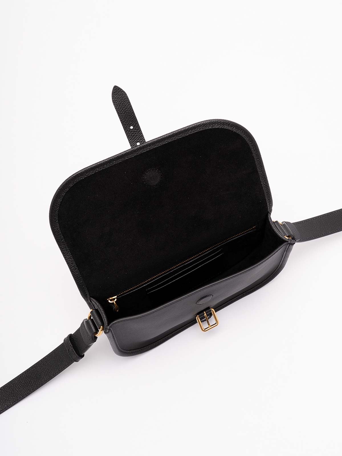 スモールクロスボディバッグ「アンティーブ」はレザー製で、コンパクトなサイズときれいなラインが特徴です。ブラックカラーは、このモデルを非常に用途の広いタイムレスなものにしています。