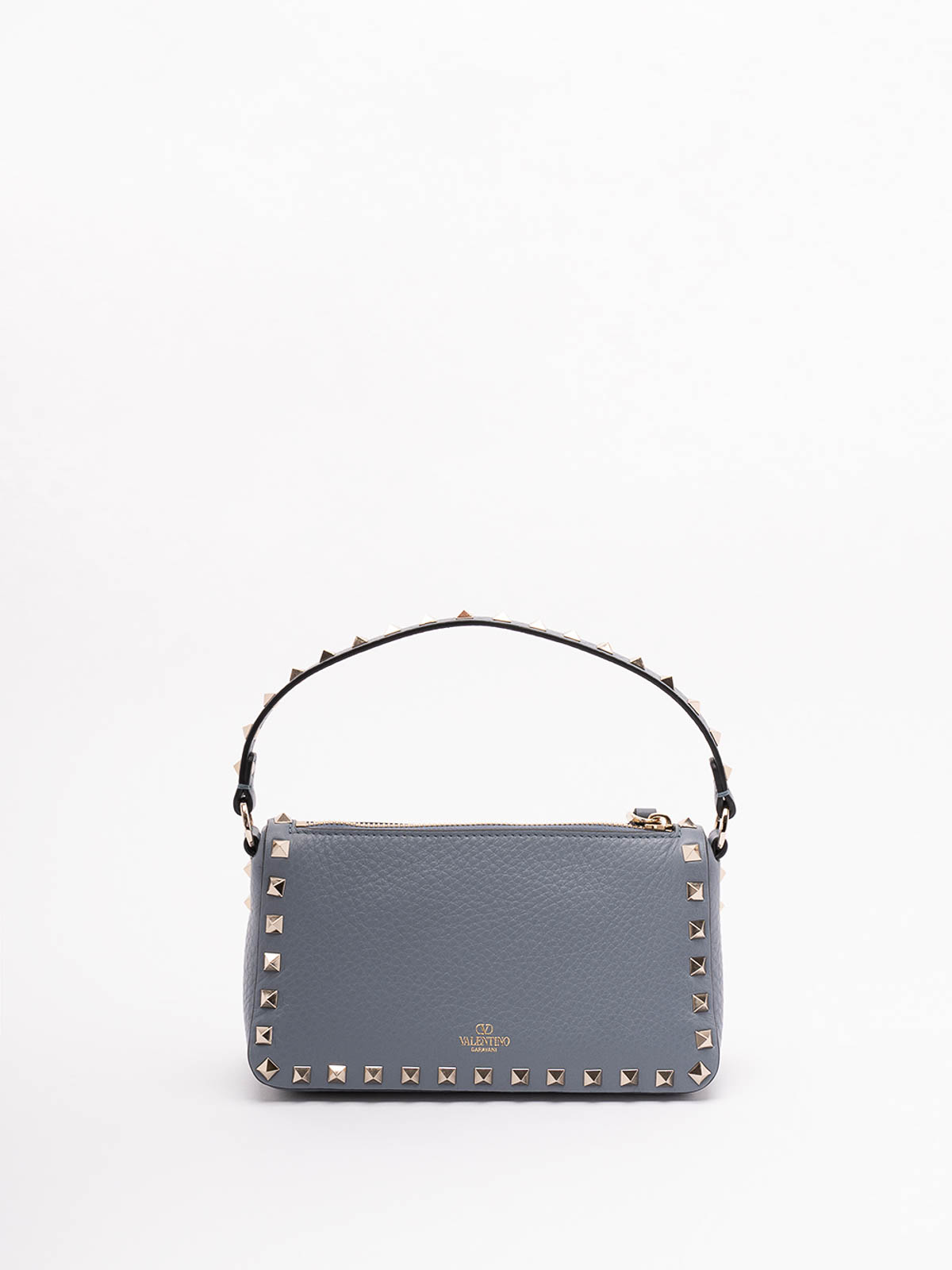 レザー製のロックスタッズスモールショルダーバッグ。アイコニックなトーン・オン・トーンのスタッズをあしらったエッセンシャルなデザインです。ストーングレーはモダンで洗練された印象を与え、都会的な装いにぴったりです。