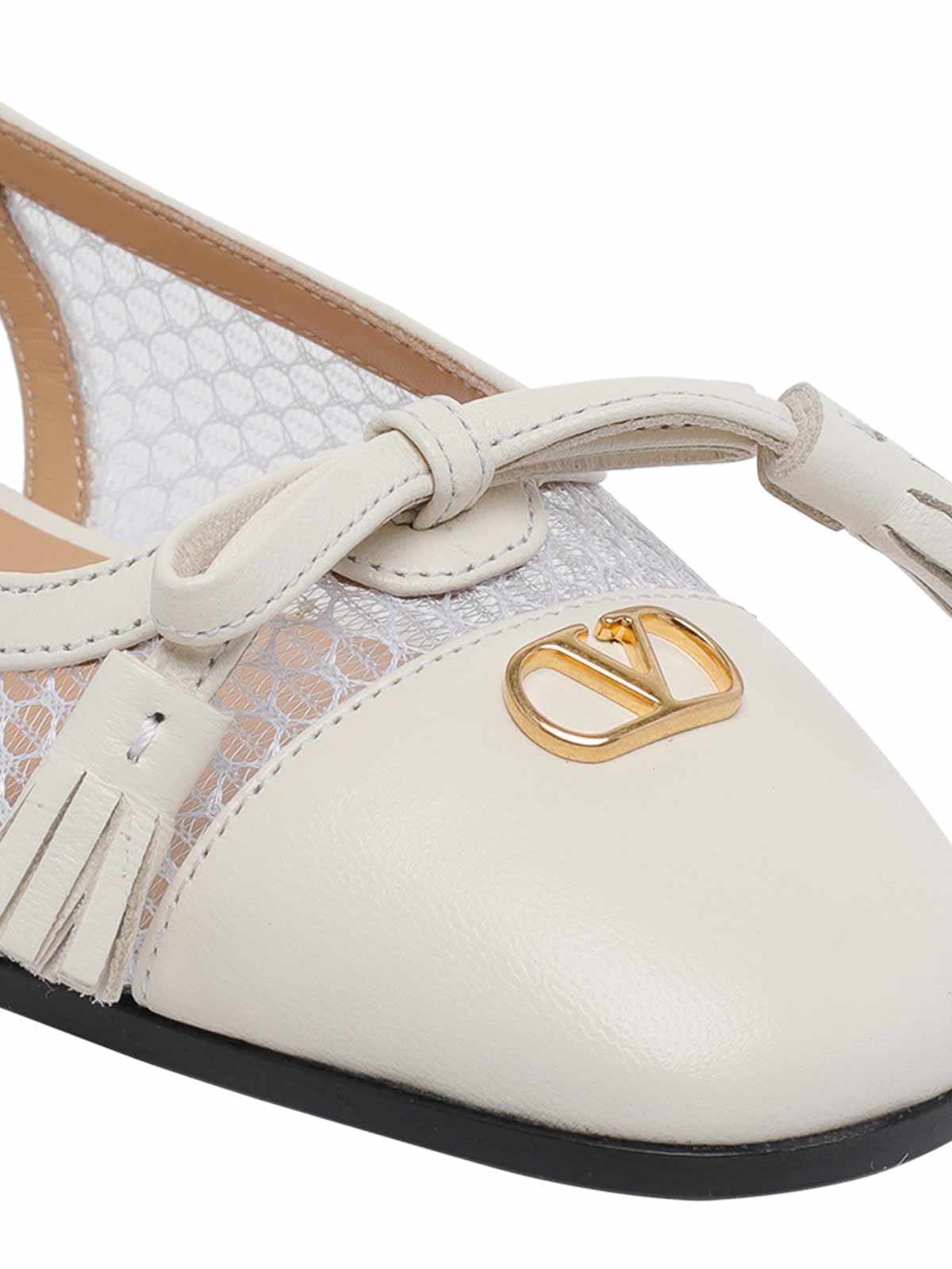 Valentino Garavani ホワイトフラットバレエ、バックルクロージャー、ラウンドトウ、メッシュ、スリングバック、リボン、ロゴ
