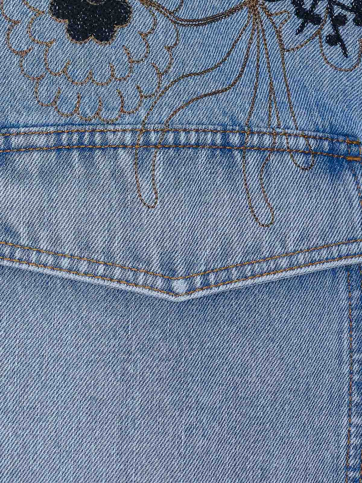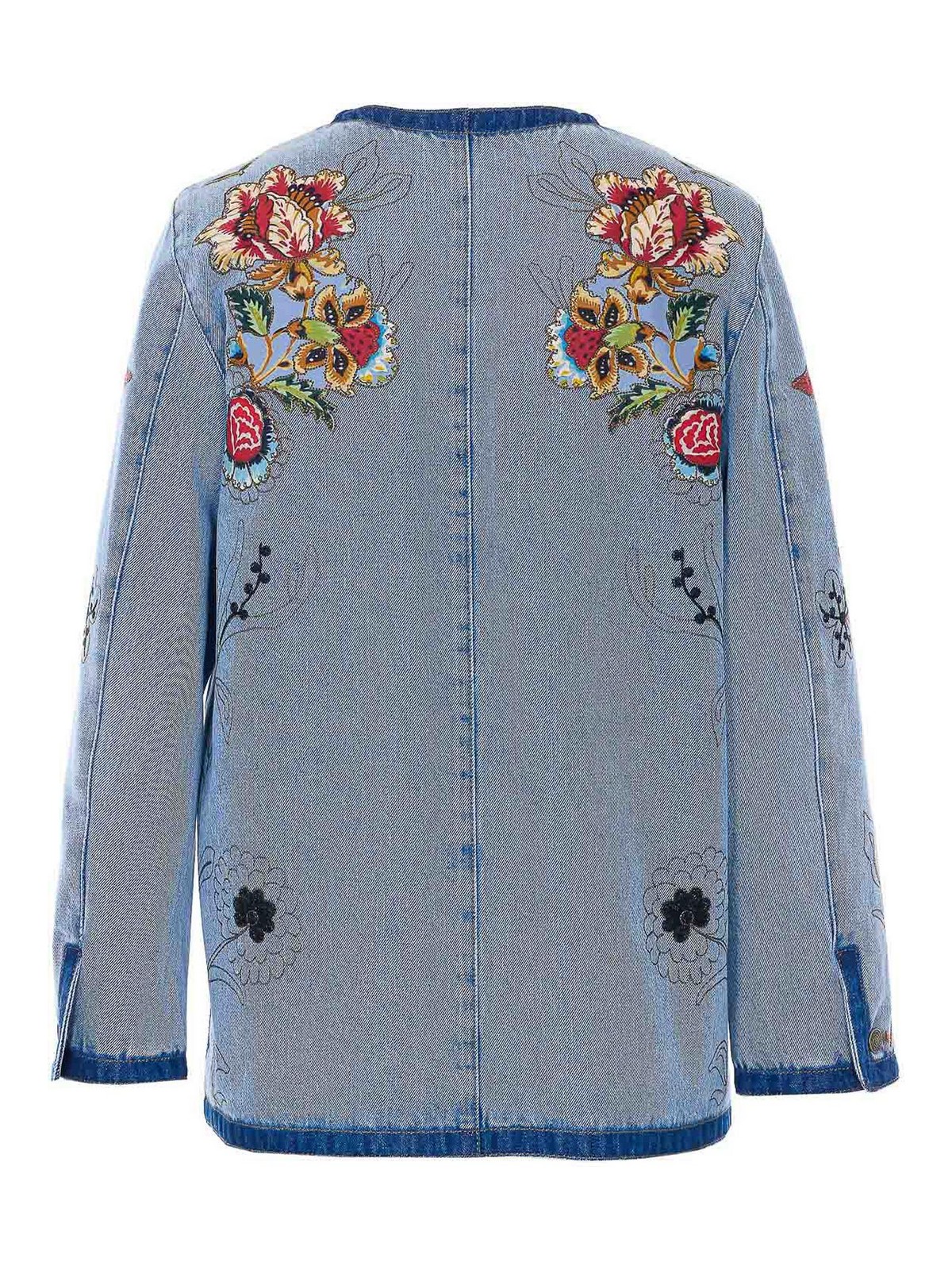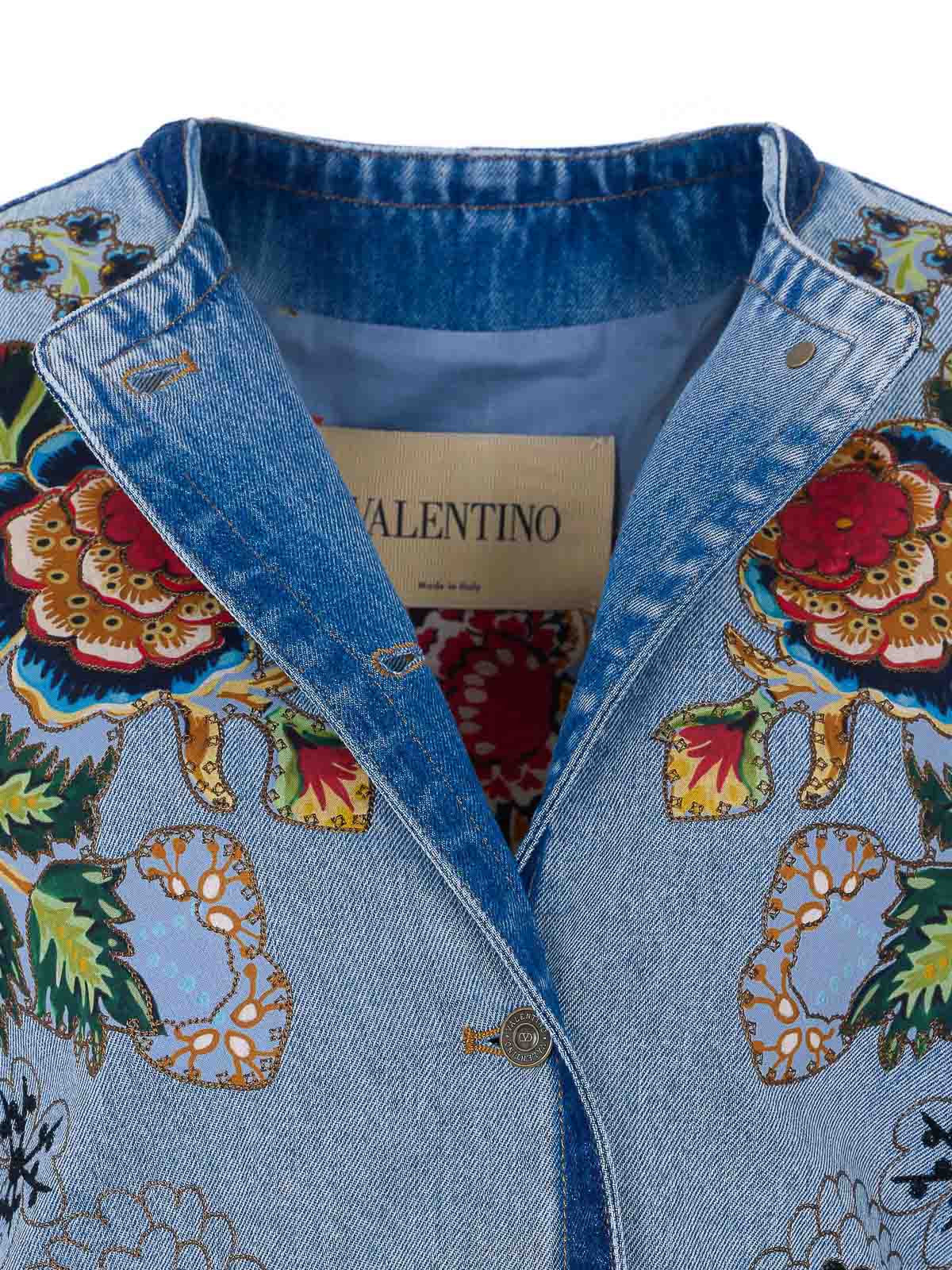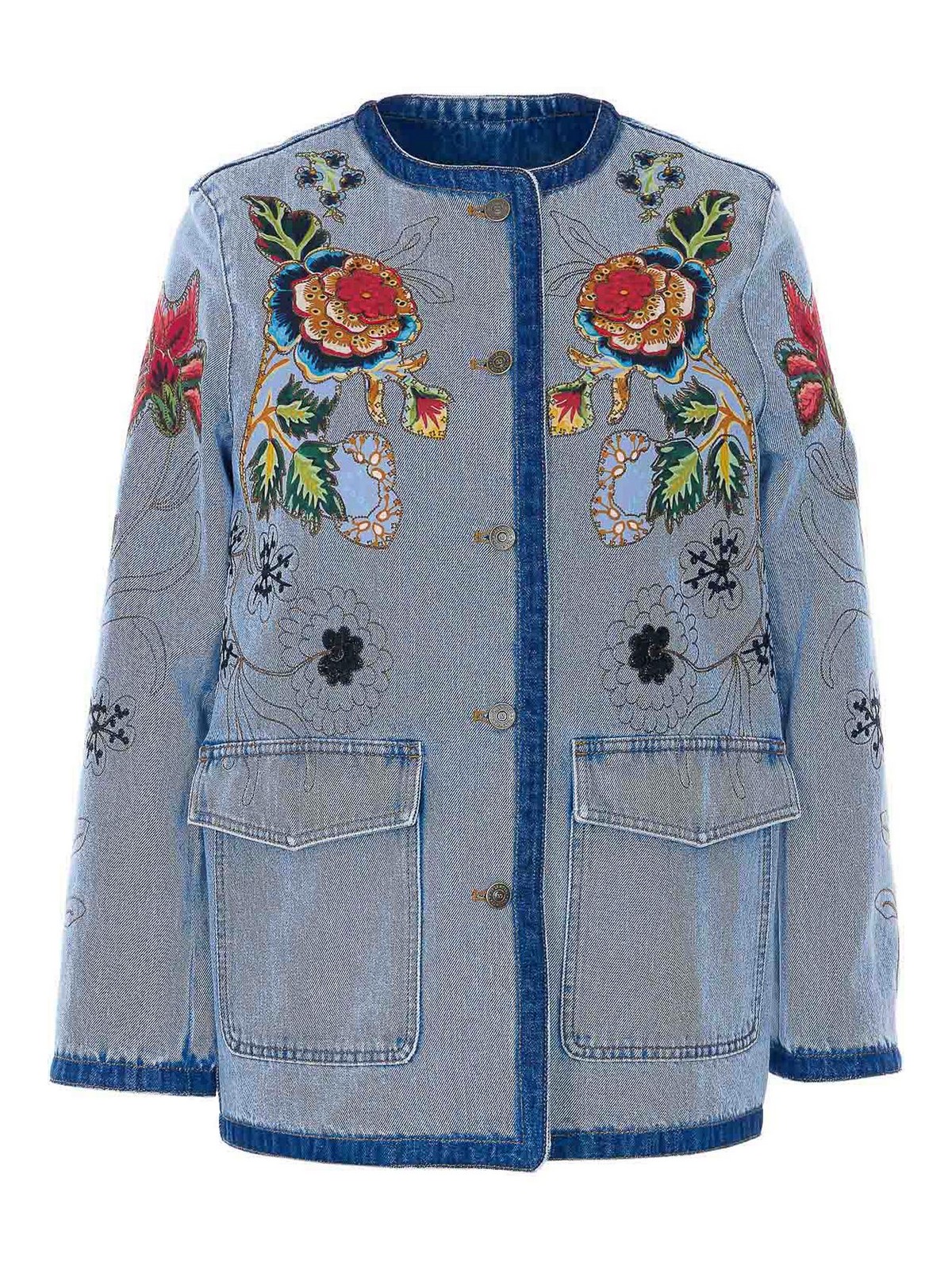 Valentino デニムジャケット、フロントボタン留め、クルーネック、ポケット、刺繍入り花柄ディテール付き