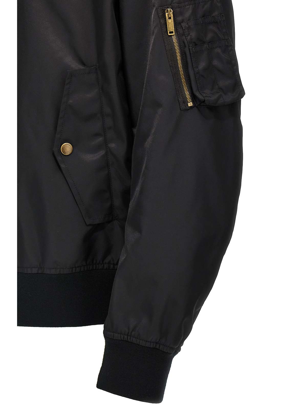テクニカルファブリックのボンバージャケット、前面にレザーとメタルのロゴパッチ、ジッパー、ポケット、ニットカフ付きロングスリーブ。