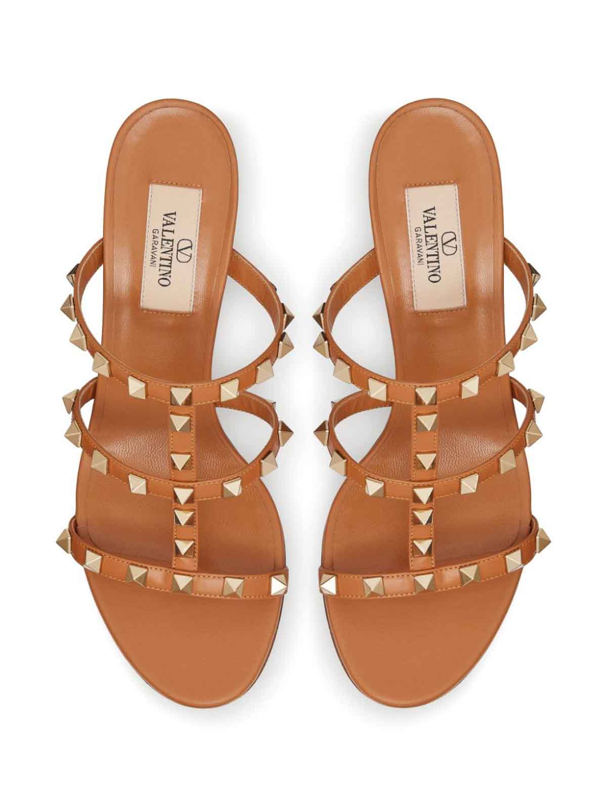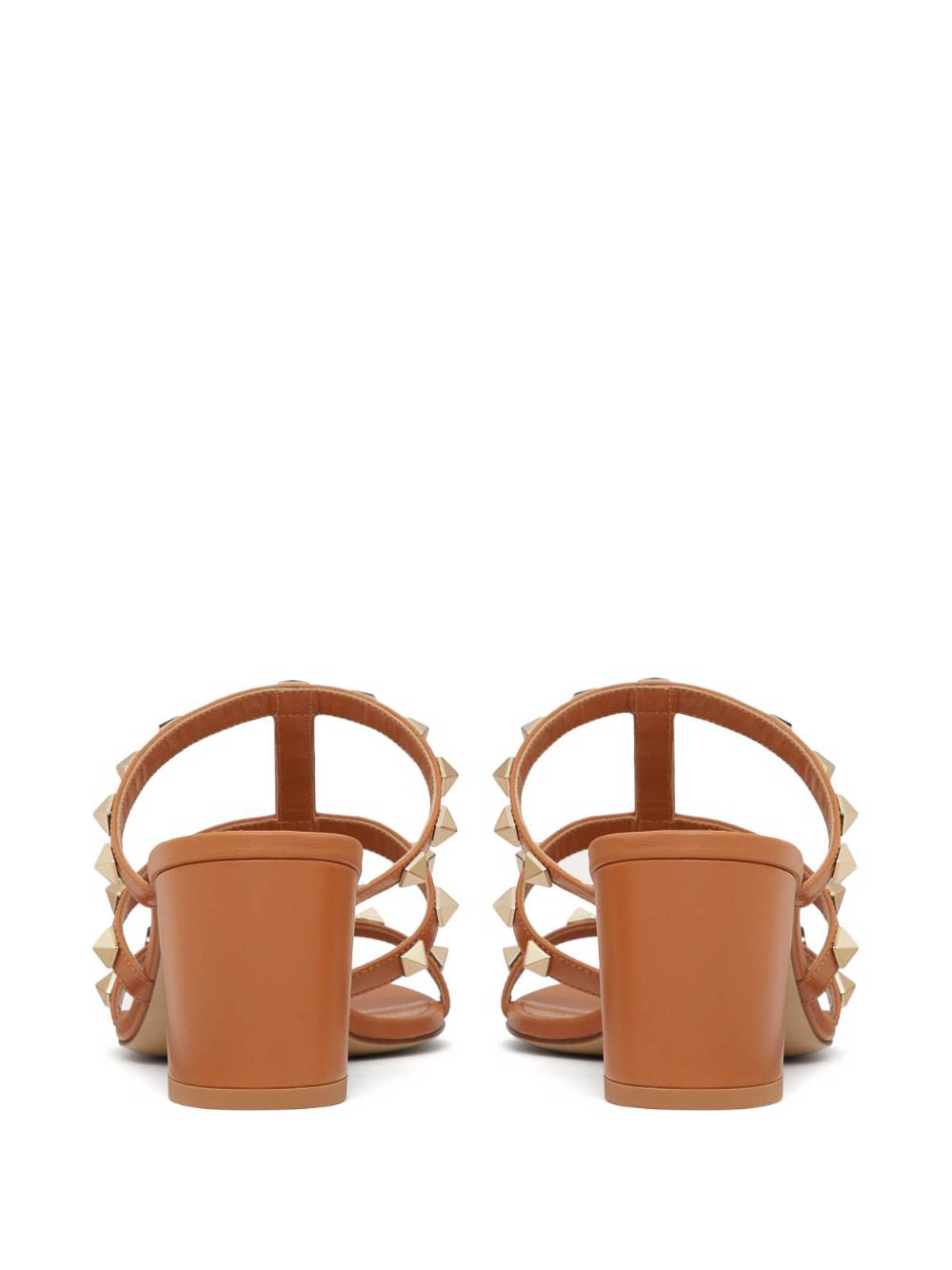 ヴァレンティノサンダルキャメルブラウンカーフレザースムースグレインゴールドトーンロックスタッズディテールケージデザインオープントゥスリッポンスタイル 60mm ブロックヒールブランドレザーインソールレザーアウトソールフルルックヴァレンティノガラヴァーニアクセサリー付き