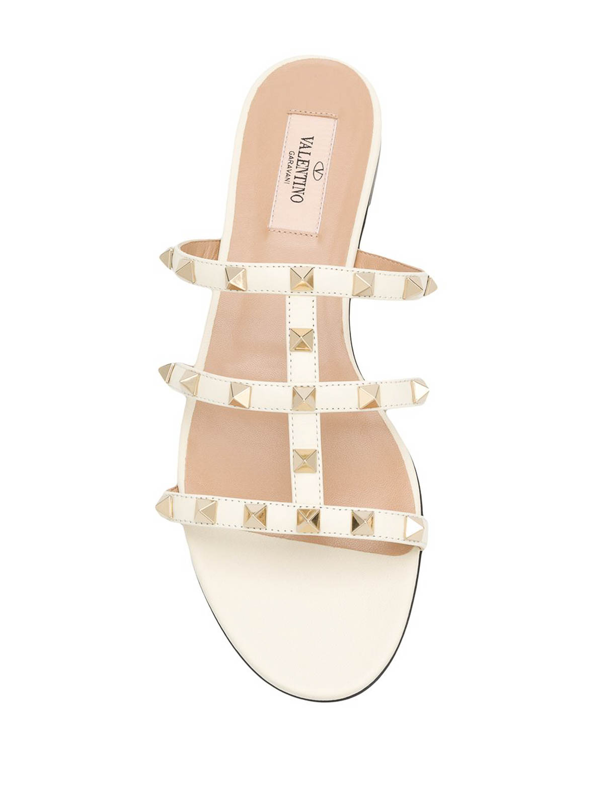 アイボリー、カーフスキン、ゴールドトーンのロックスタッズ装飾、ケージデザイン、スリッポンデザイン、オープントゥ、ロゴインソール、フラットレザーソール。