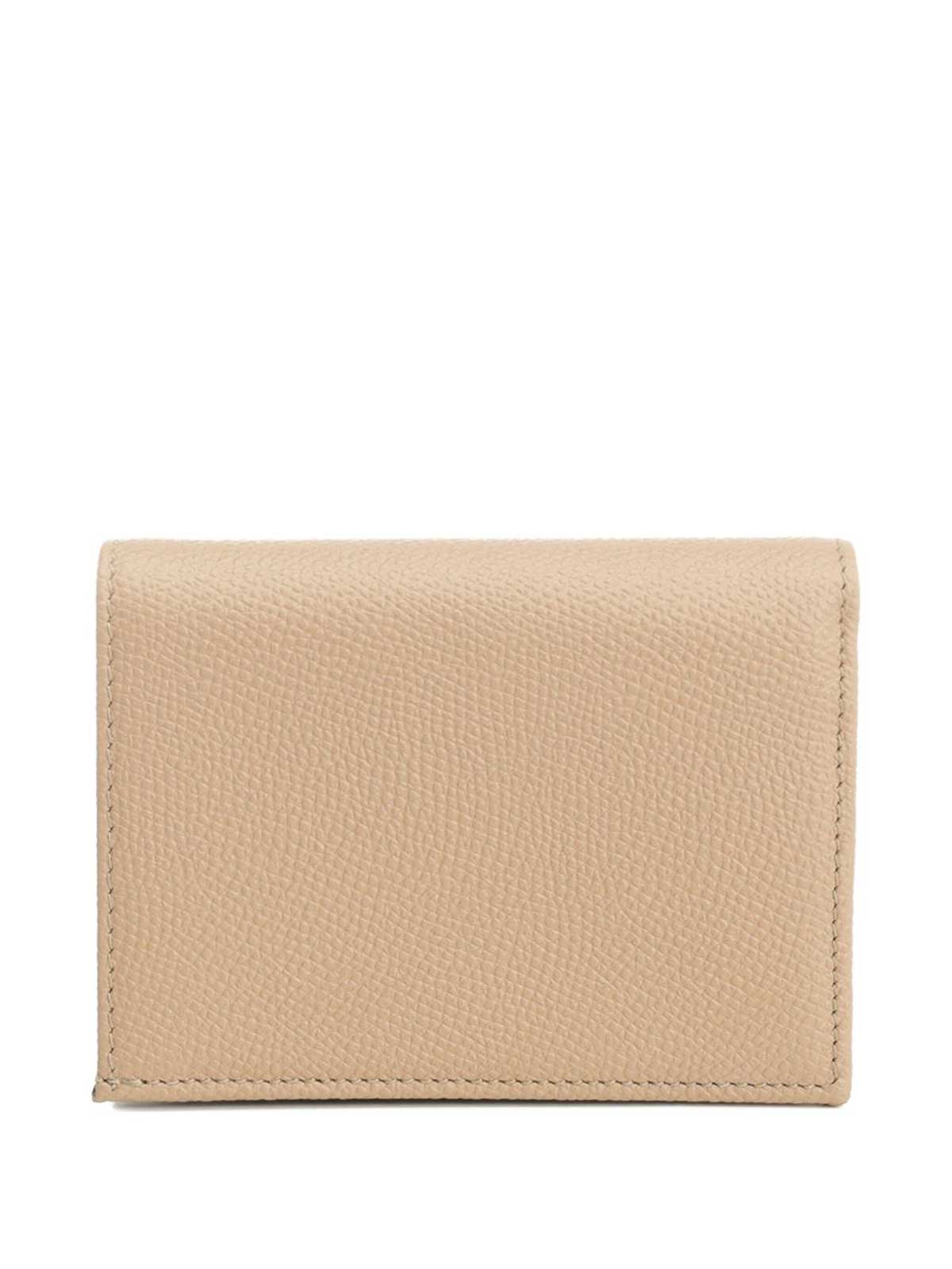 ベージュのペブルグレインレザーゴールドトーンのロゴジッパー、複数のカードスロット、折りたたみ式クロージャー。ヴァレンティノガラヴァーニのアクセサリーもフルルック。
