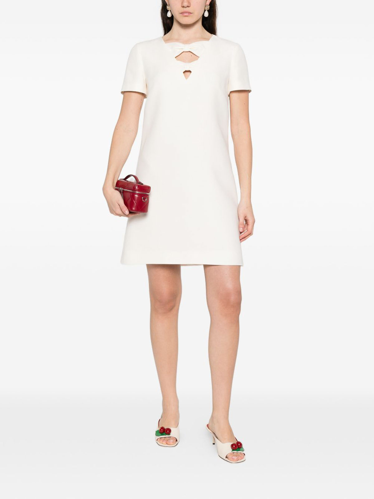 クリームホワイト、カットアウトディテール、リボンディテール、ショートスリーブ、ラウンドネック、コンシールドファスナー