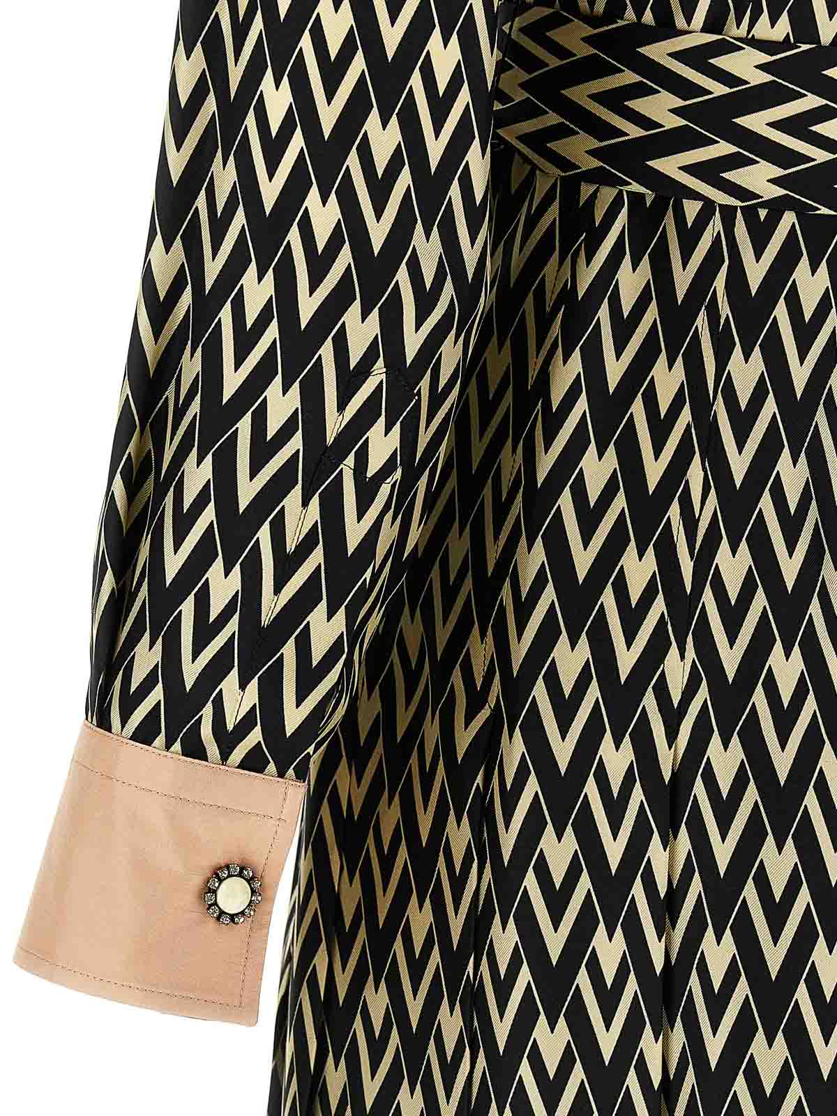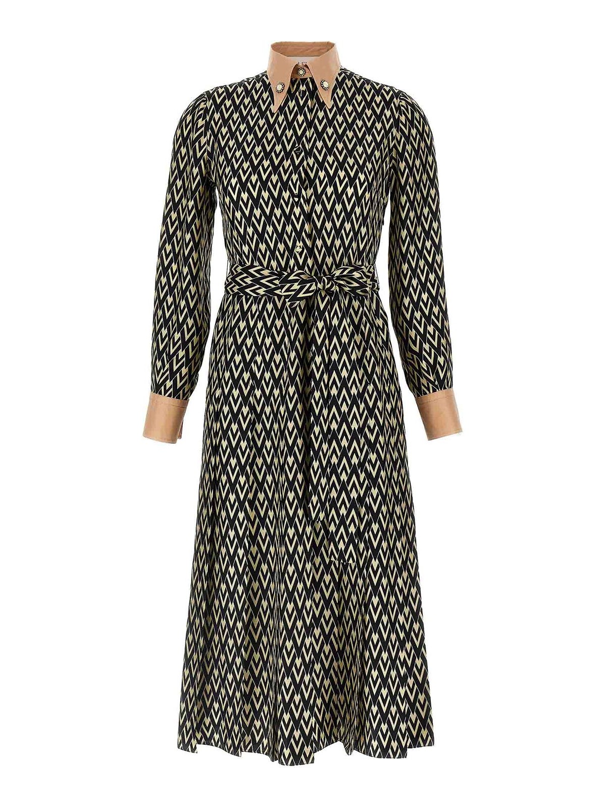 全面に「toute la v」プリントを施したシルクツイルのミディドレス、ジュエルのディテールをあしらったコントラストカラー、ボタン留め、コントラストの効いたカフスとジュエルボタンが付いたロングスリーブ、取り外し可能なベルト。