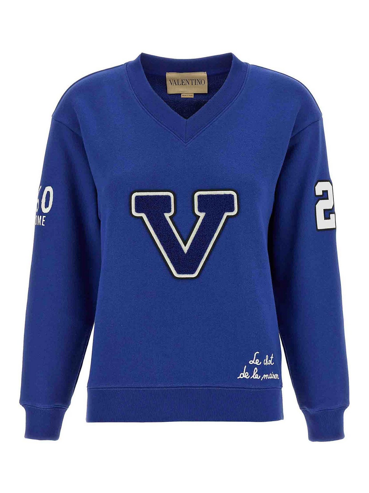 起毛コットンのスウェットシャツ、コラージュ柄、Vネック、パッチ刺繍、「シャ・ド・ラ・メゾン」プリント、ロングカフスリーブ。「シャ・ド・ラ・メゾン」