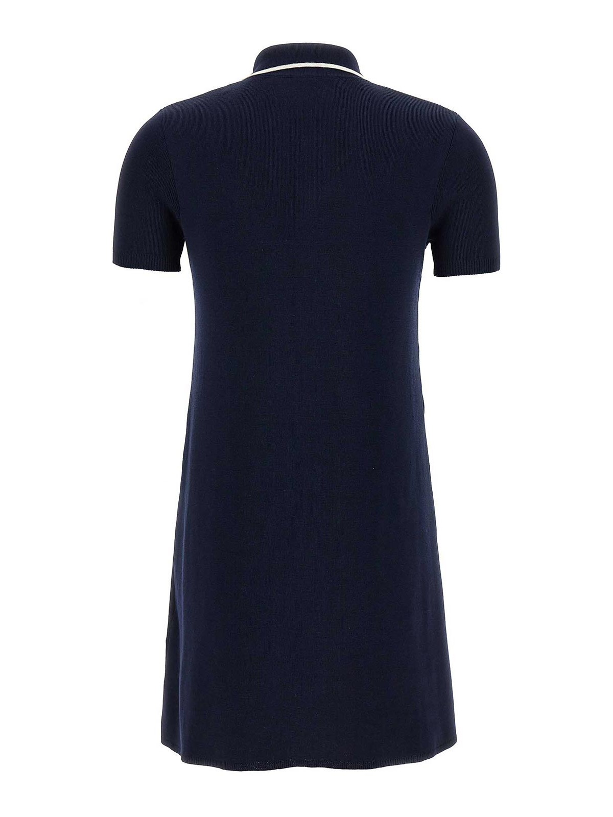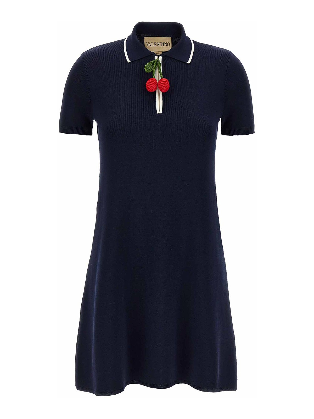 コントラストの効いたディテールと、かぎ針編みの「チェリーフィック」ジッパープル、Aラインシルエット、ショートスリーブが特徴のコットンニットのポロミニドレス。